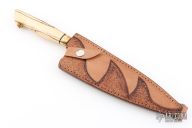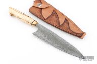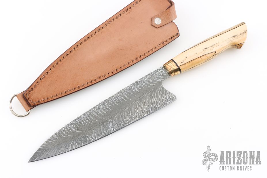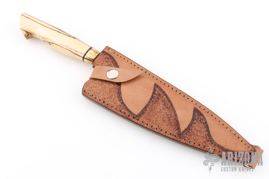 This Kitchen Knife by Black Ore Knives features a Feather Damascus blade with .106" blade stock and 1.915" blade depth, hidden construction. The handle has a mokume guard and a spalted maple grip. Comes with a hand tooled brown leather sheath. New from maker.