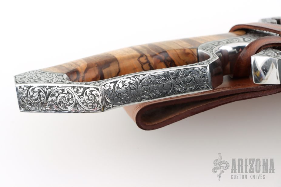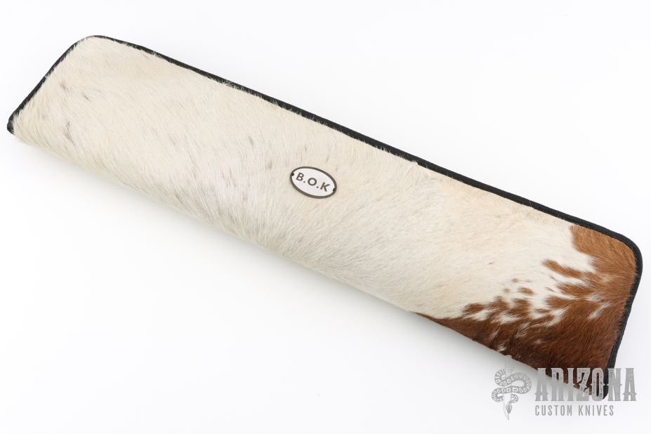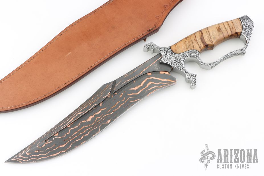 This D-Guard Bowie by Black Ore Knives features a Copper Carbon San Mai Damascus blade with false top edge and milled fullers, .237" blade stock and 2.350" blade depth, hidden tang construction. The handle has an engraved stainless steel D-Guard with black spacers, wood grip. Comes with a hand tooled brown leather sheath. New from maker. Comes with a zippered case.