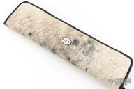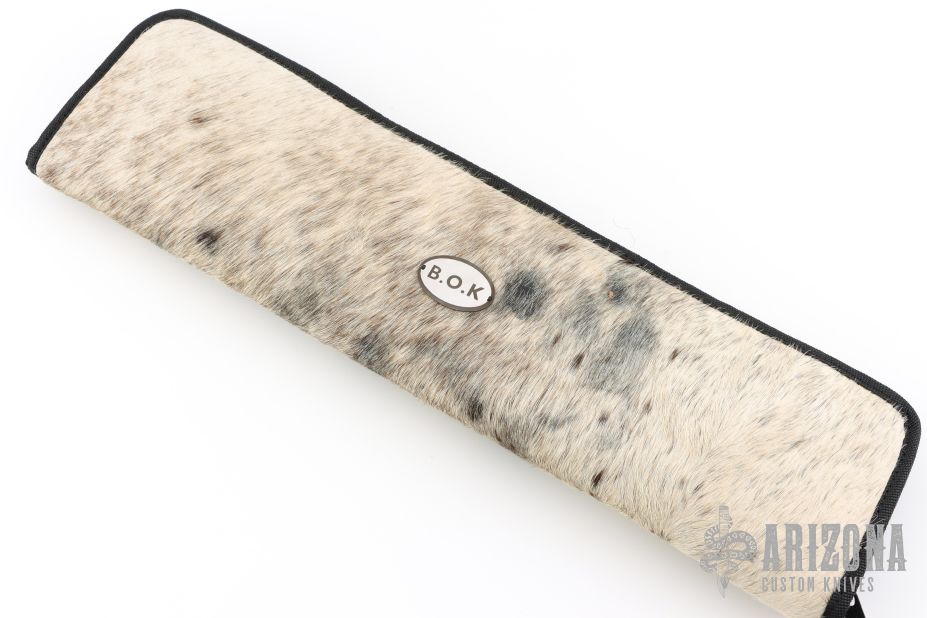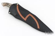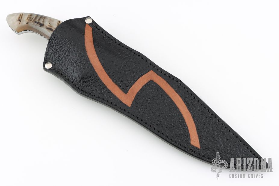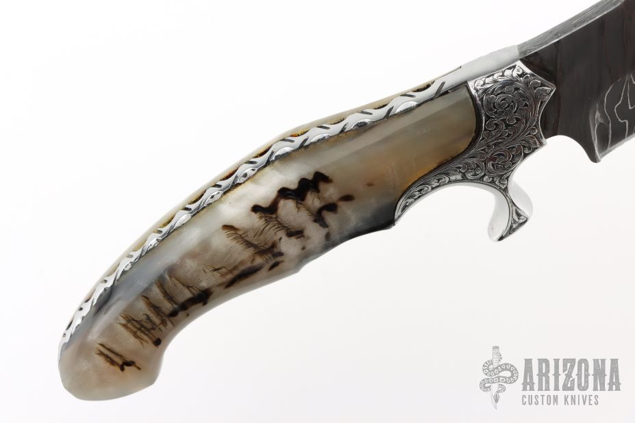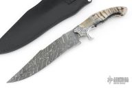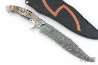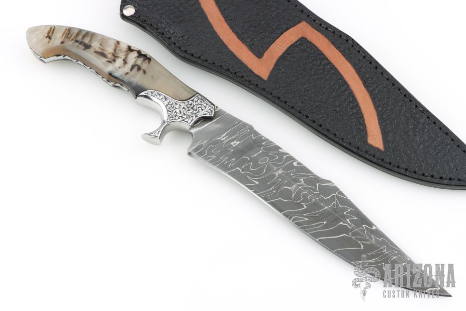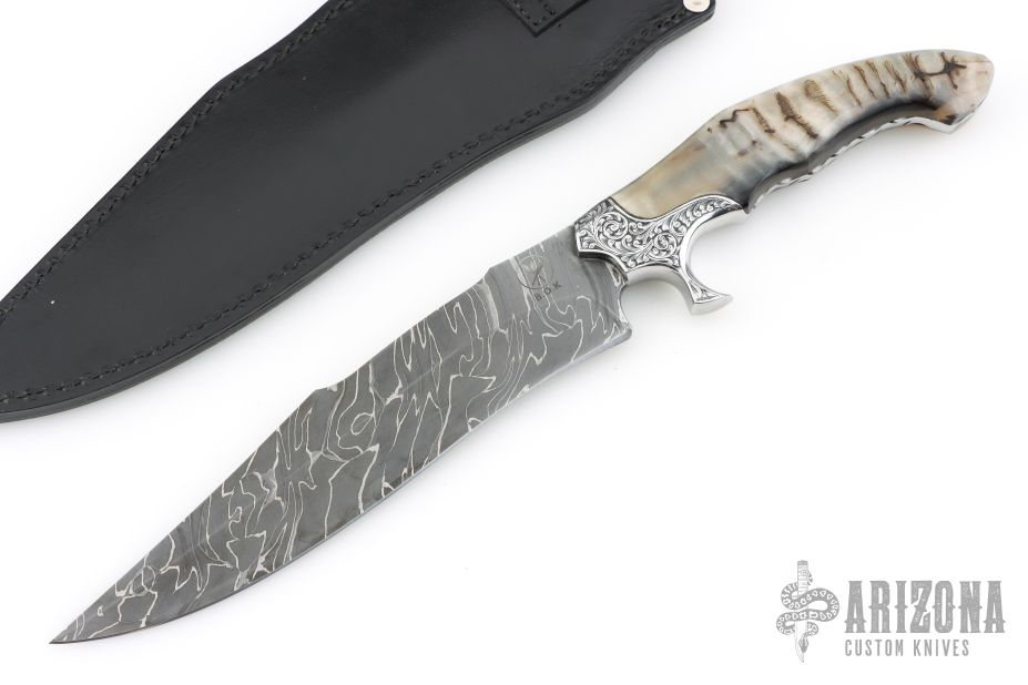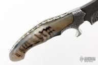 This Integral Defender Fighter by Black Ore Knives features a Damascus blade with false top edge, .222" blade stock and 1.824" blade depth, full tang construction. The handle has engraved stainless steel bolsters, fully fileworked tang, and sheep horn scales. Comes with a hand tooled black/brown leather sheath and a zippered case. New from maker.
