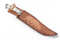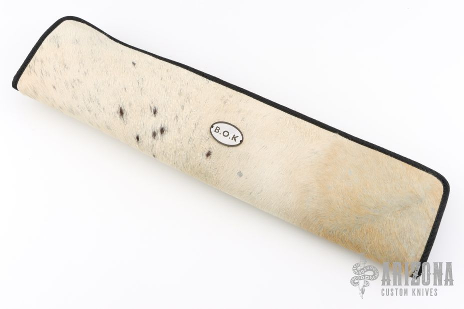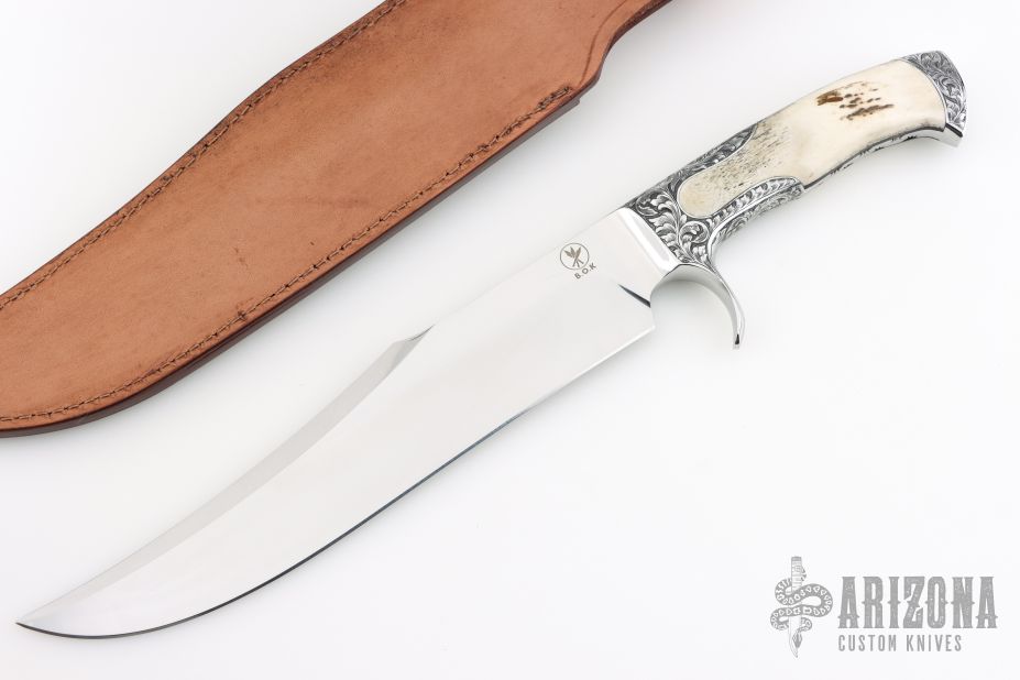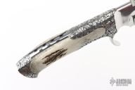 This Integral Defender Fighter by Black Ore Knives features a mirror polished blade with false top edge, .209" blade stock and 2.009" blade depth, full integral construction. The handle has integral engraved guard and rear bolsters, fully fileworked tang, and stag scales. Comes with a hand tooled brown leather sheath and a zippered case. New from maker.