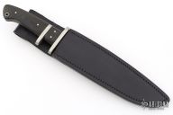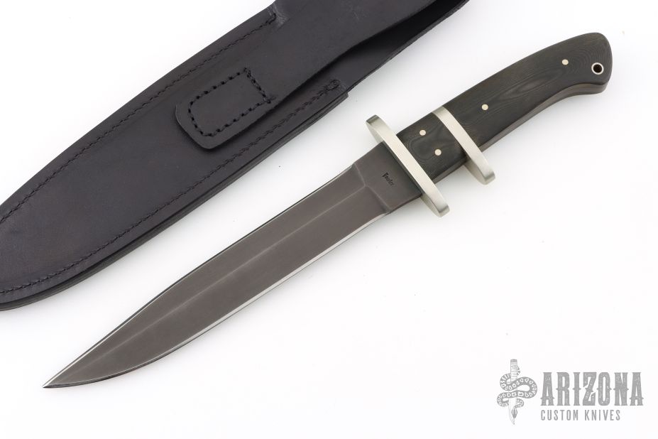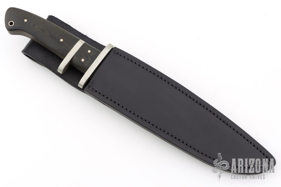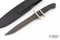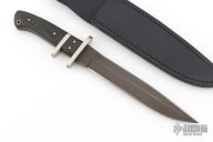 This knife by Ricky Fowler features an acid etched blade with top edge, .188" blade stock and 1.336" blade depth, full tang construction. The handle has a guard, pinned micarta covers, sub-hilt, and lanyard hole in pommel. Comes with leather belt sheath and zipper case. Has some scuffs and scratches, great condition otherwise.