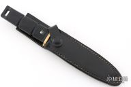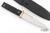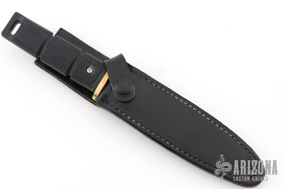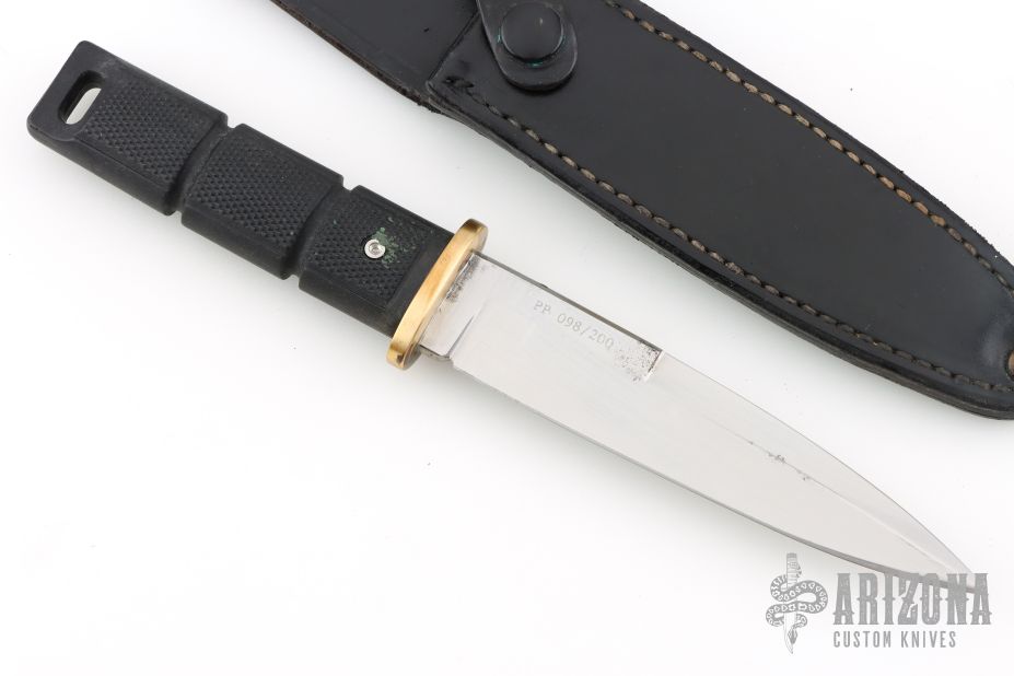 This Al Mar Tanken Scout Phantom has a satin finished spear point blade with sharpened top edge, .193" blade stock and 1.120" blade depth, hidden tang construction. The handle has a brass guard and black polymer handle. Comes with a black leather Al Mar sheath marked 4006/4007 on the rear. The knife has some scuffs, scratches, and a light patina. Great condition otherwise.