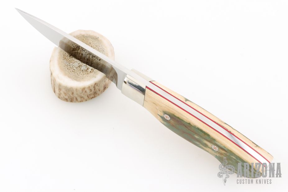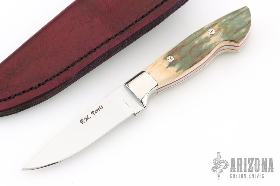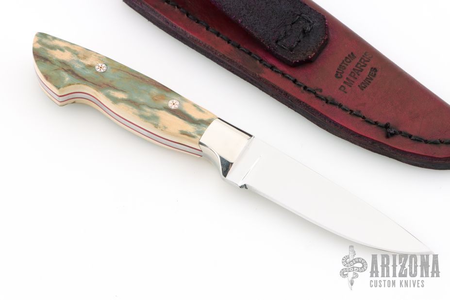 This fixed blade from Phillip M. Parris features a mirror polished blade with .146" blade stock and .995" blade depth, full tang construction. The handle has dovetailed nickel silver bolsters and mammoth ivory scales with mosaic pins and red liners. Comes with a maroon leather sheath with belt loop. New from maker!