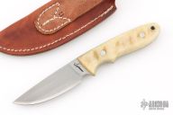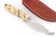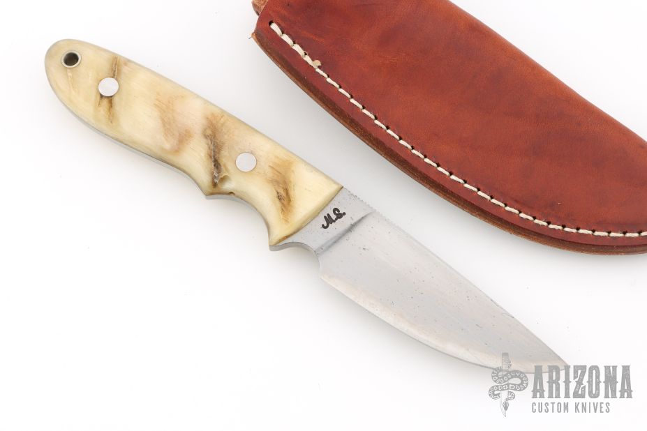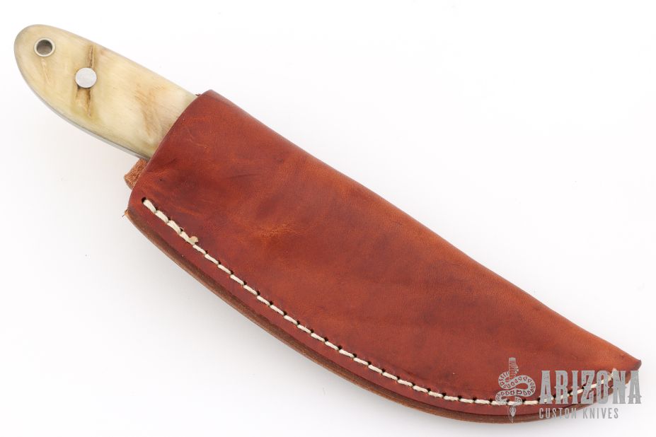 This Utility Hunter by Master Smith Jerry Lairson Sr. of Pine Creek Forge features a hand rub satin finished drop point blade with notched thumb rest and polished edge, .163" blade stock and 1.100" blade depth, full tapered tang construction. The handle features pinned sheep horn covers with lanyard hole in pommel. Comes with a leather belt sheath. Has some light scratches, excellent condition otherwise.