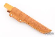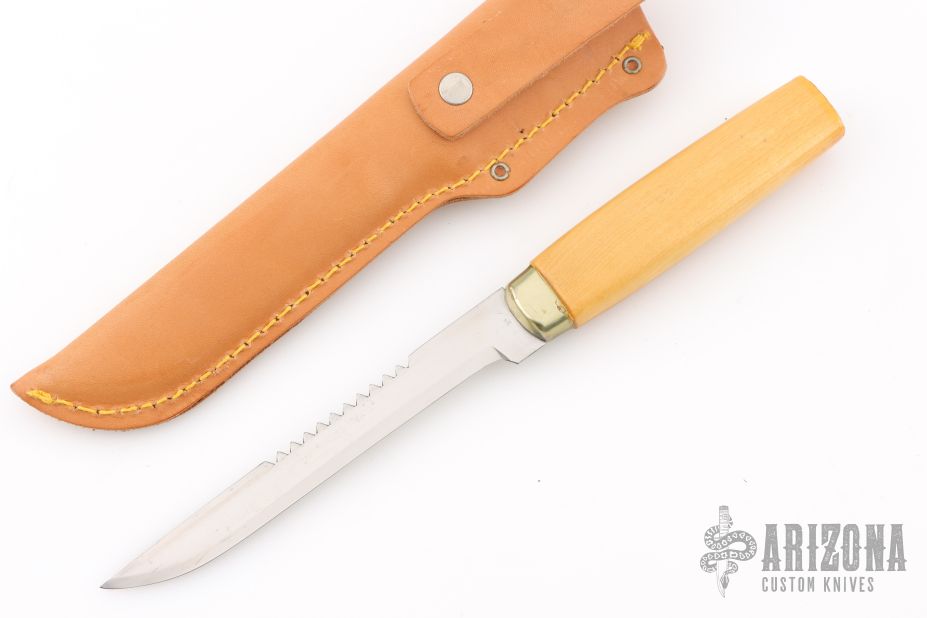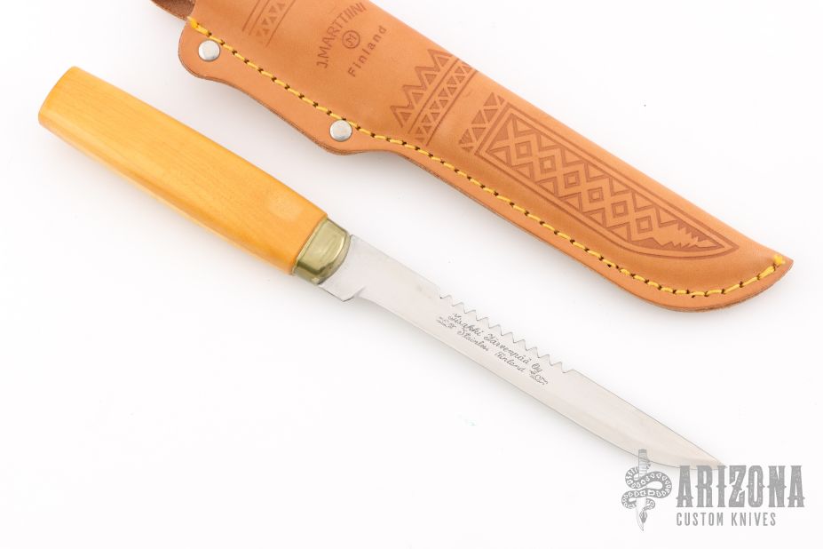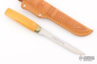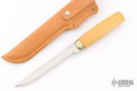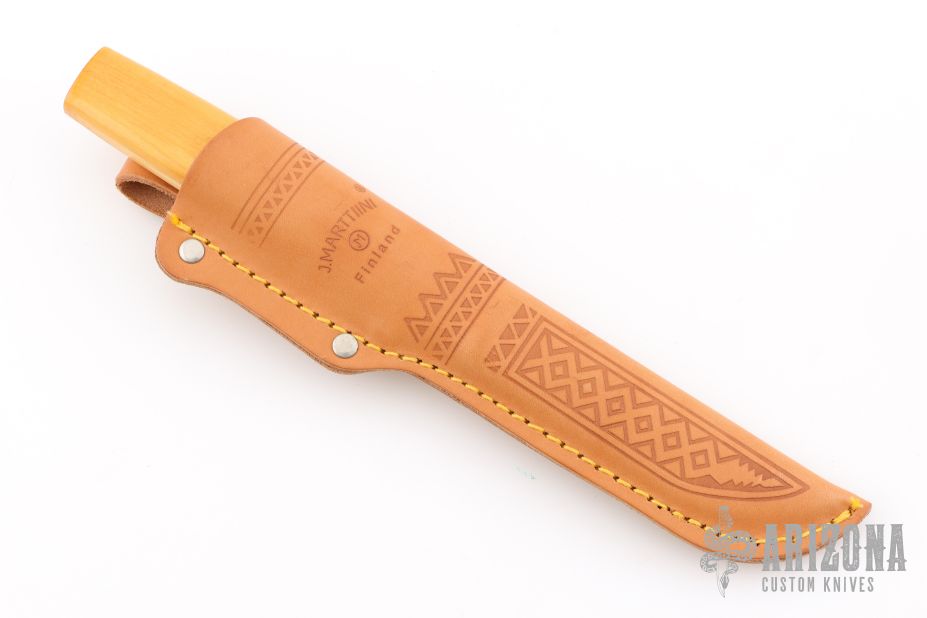 This knife by J Marttiini features a satin finished scandi ground blade with .060" blade stock and .723" blade depth, hidden tang construction. The handle has a nickel silver ferrule and wood grip. Comes with a brown leather sheath. Has been resharpened and has some light scratches. Great condition otherwise.