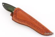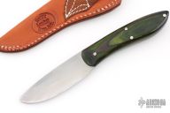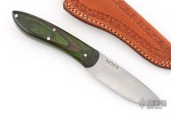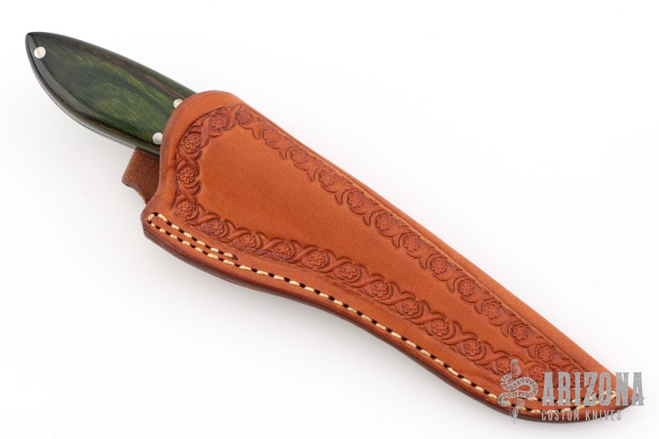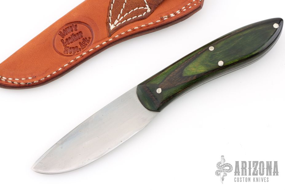 This early hunter by Fitch features a flat ground blade with a hand rubbed satin finish and false top edge, .160" blade stock and 1.189" blade depth, full tapered tang construction. The handle has wood scales with nickel silver pins. Comes with a hand tooled leather belt sheath by Rowe's Leather. Has some light scratches, great condition otherwise.