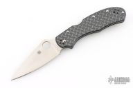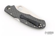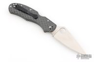 This lock-back folder features a satin finished blade with thumb-hole and notched thumbrest. The handle has carbon fiber scales, stainless steel liners and back-spacer, and black stainless steel clip, 4-way reversible. Comes with original box and papers. New condition.