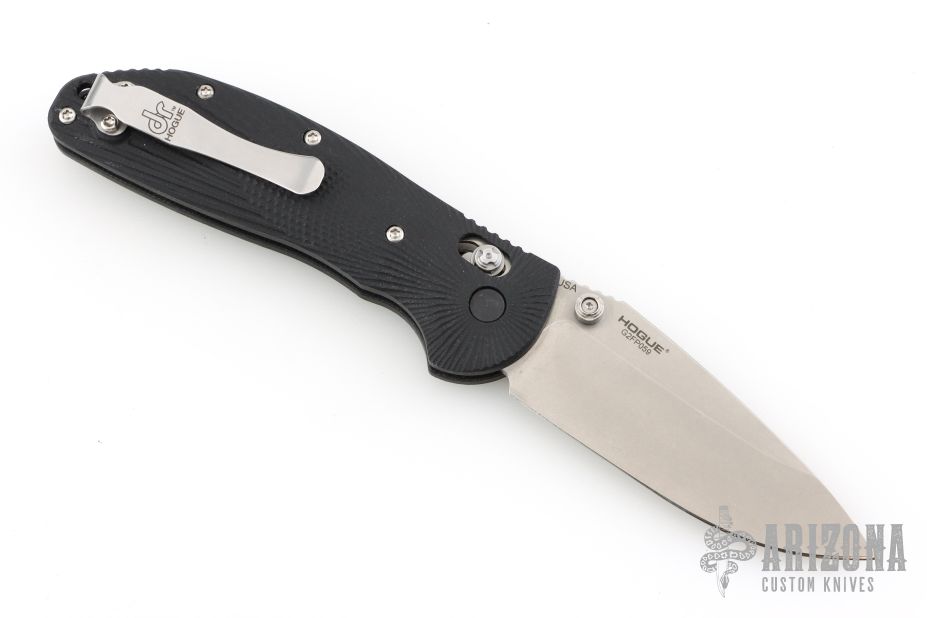 This Doug Ritter RSK by Hogue Knives features a stonewashed blade with notched thumbrest and dual thumbstuds. The handle has milled black G-10 scales with a stainless steel tip up reversible clip. Comes with original box, zippered case and papers. Excellent condition.