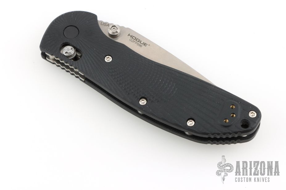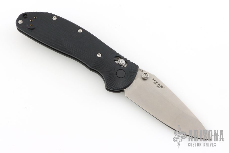 This Doug Ritter RSK by Hogue Knives features a stonewashed blade with notched thumbrest and dual thumbstuds. The handle has milled black G-10 scales with a stainless steel tip up reversible clip. Comes with original box, zippered case and papers. Excellent condition.