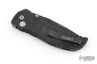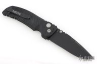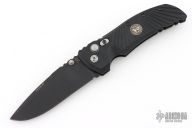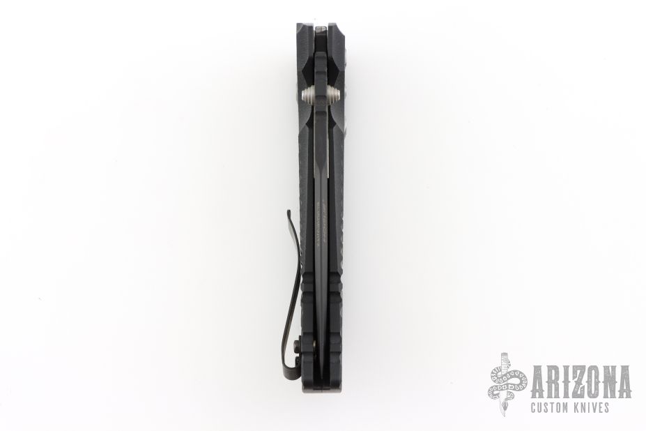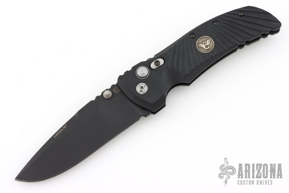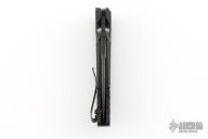 This Hogue/Elishewitz design features a black blade with dual thumbstuds and notched thumbrest. The handle has milled black G-10 frame with button lock, safety and tip down carry clip. Comes with original box, papers, extra clip, and zipper case. Has a couple light scuffs, and some scratches on the clip, excellent condition otherwise.