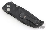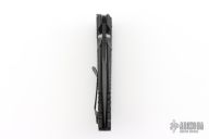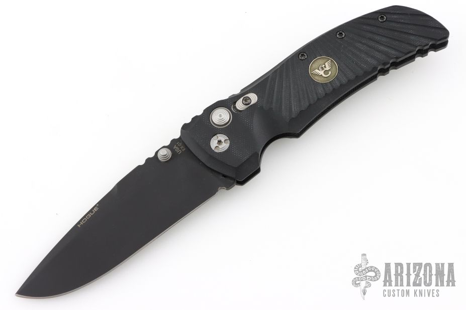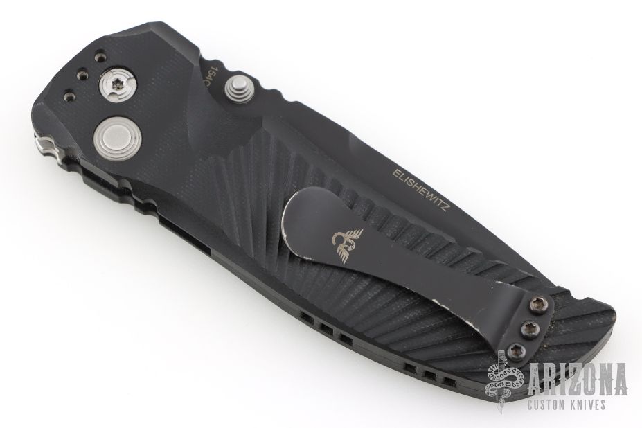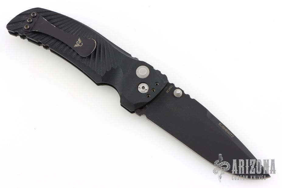 This Hogue/Elishewitz design features a black blade with dual thumbstuds and notched thumbrest. The handle has milled black G-10 frame with button lock, safety and tip down carry clip. Comes with original box, papers, and zipper case. Has a couple light scuffs, and some scratches on the clip, excellent condition otherwise.