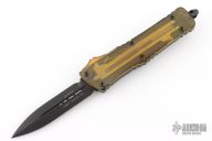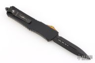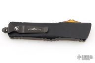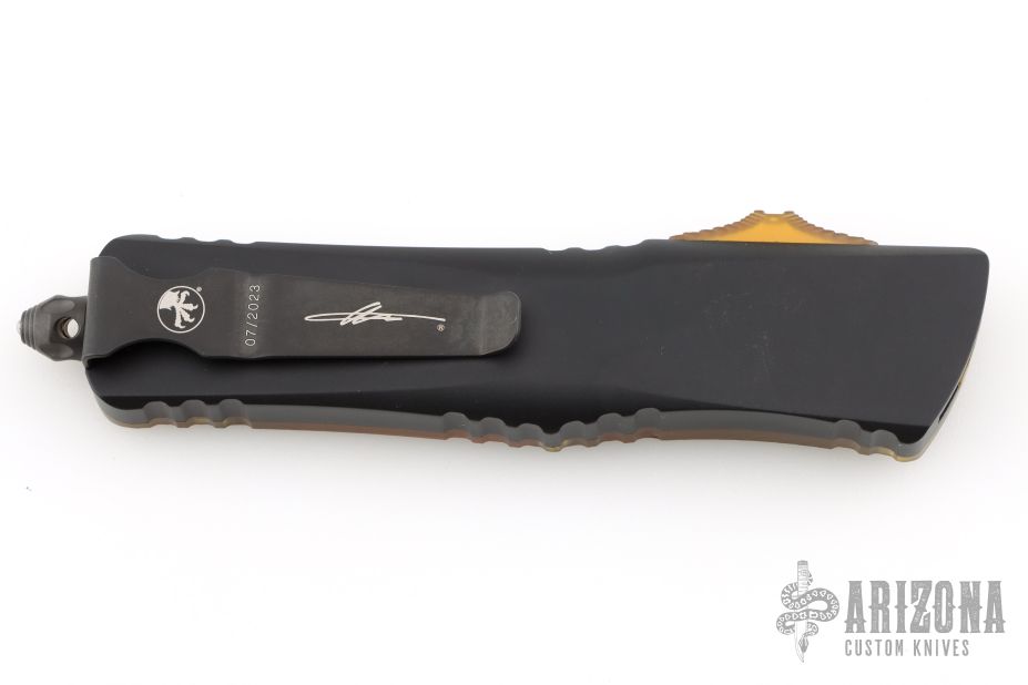 This Combat Troodon OTF automatic features a DLC D/E blade with a standard edges. Ultem Top and button, black aluminum frame, black stainless steel clip, reversible tip down carry. Glass breaker. Excellent Condition. Dated 07/2023