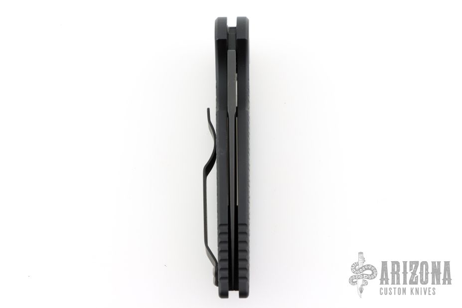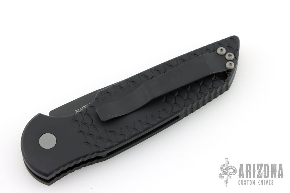 This TR-3 by Pro-Tech Knives features a black spear point blade. The handle has a black fish scale aluminum handle with stainless steel tip up clip. Excellent condition.