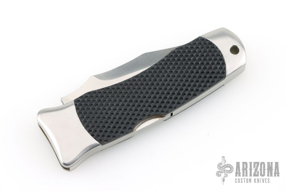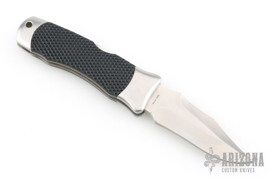 This Vintage Large Tomcat lock back by SOG features a satin finish blade with false top edge and nail nick. The handle has satin finished stainless steel bolsters, liners and backspacer, checkered rubber scales. Strong lock up. Comes with original box and nylon belt sheath. Has a few light scratches, otherwise excellent condition.