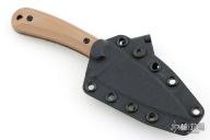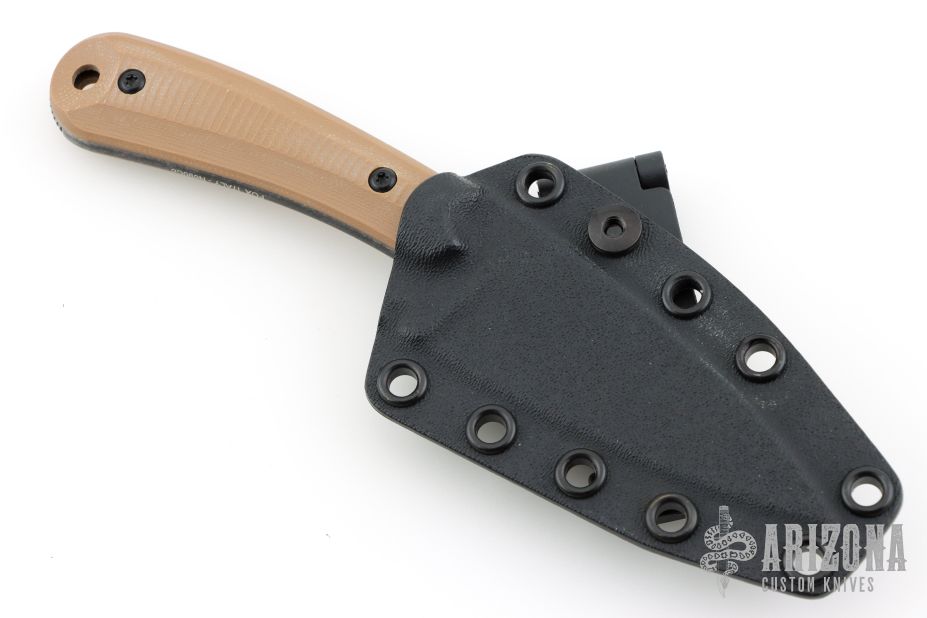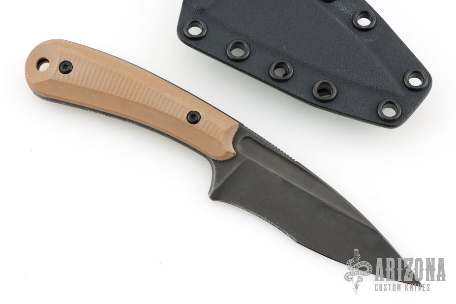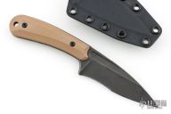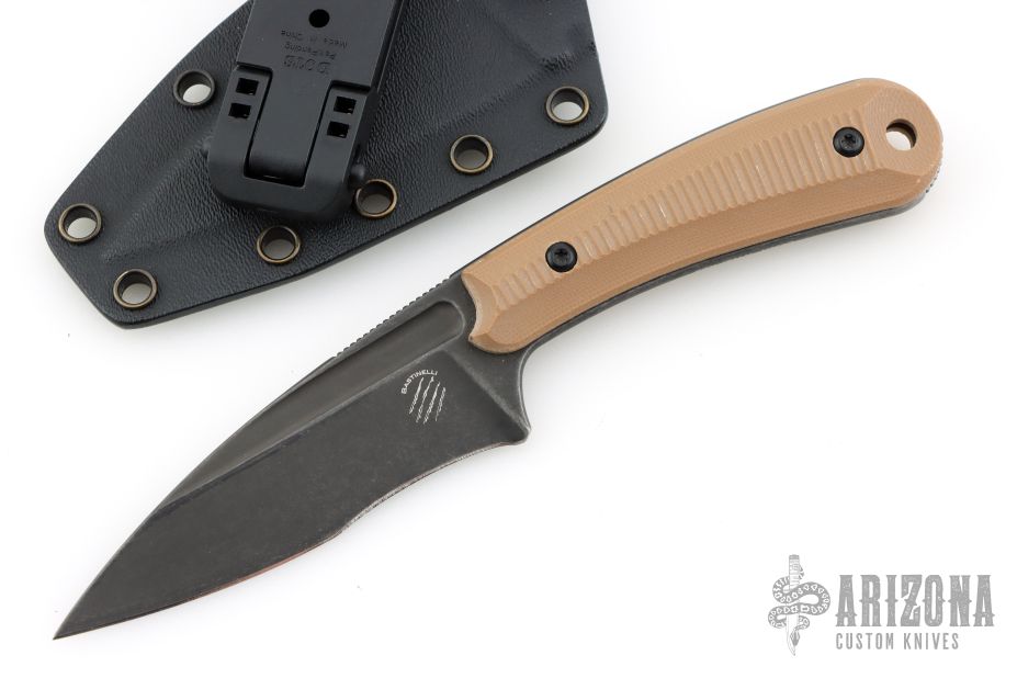 This SIN by Bastinelli Knives features a dark stonewashed recurve blade with notched thumbrest and fullers, .140" blade stock and 1.242" blade depth, full tang construction. The handle has coyote brown G-10 scales. Comes with kydex sheath. Has some light scuffs, otherwise excellent condition.