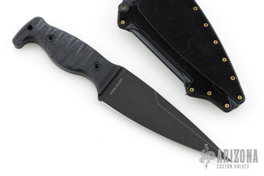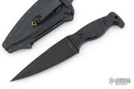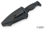 Has a black stonewashed blade with .191" blade stock and 1.461" blade depth, full tang construction with black G-10 scales. Comes with ambidextrous kydex sheath with velcro loops on one side and a metal clip on the other. The sheath also holds a fire steel in the sheath. Excellent condition.