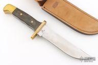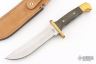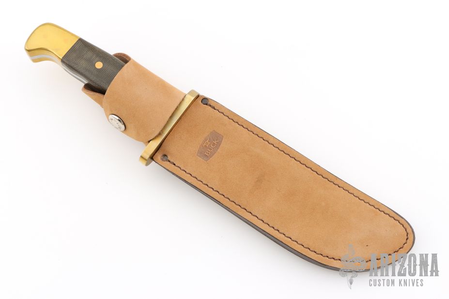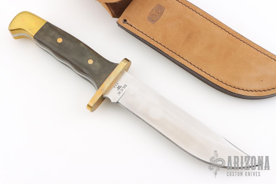 This Frontiersman by Buck features a satin blade and green micarta scales. Brass rear bolsters and guard. Full tang construction with .187" thickness and depth of 1.360". Comes with leather sheath, card, and original box. Excellent condition. Buck of the month club special edition, limited to thirty pieces.