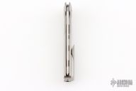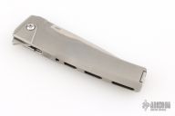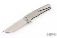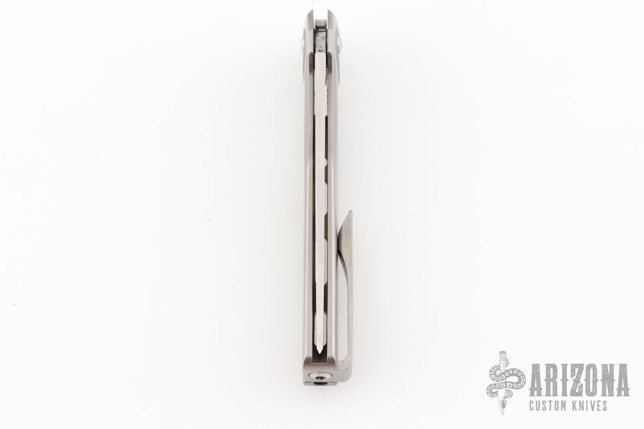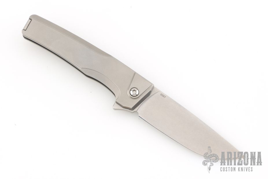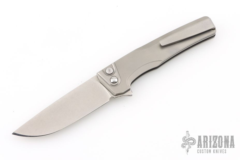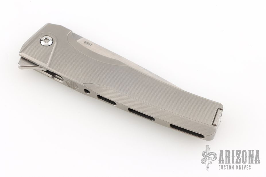 This Sonora by Machine Wise features a hand ground satin finished blade with flipper tab. The handle is bead blasted titanium with a milled integral construction. Button lock open and closure, with L/R reversible tip up clip. Includes original 3D printed box, tool, lube and card. S/N 587. Excellent Condition.