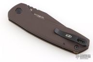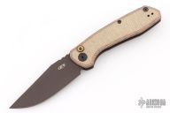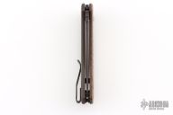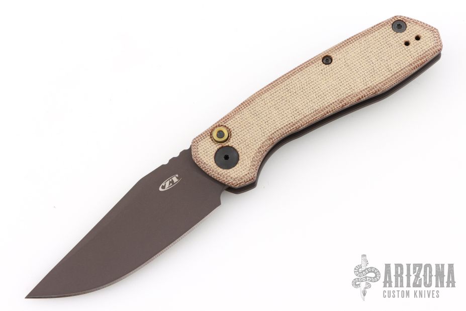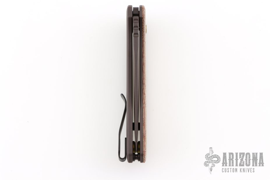 - Natural canvas micarta front handle with dark bronze Cerakote steel liner underneath; dark bronze-anodized titanium back handle