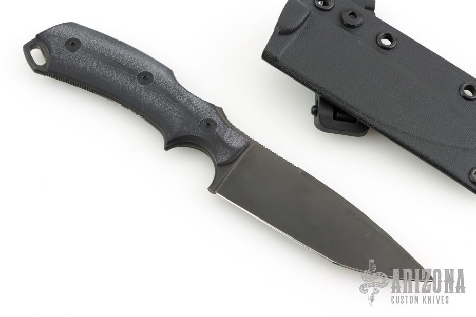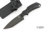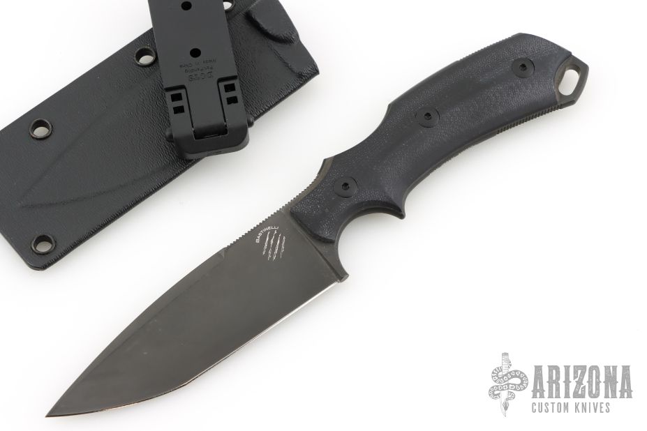 This knife by Bastinelli Knives features a black blade with notched thumbrest and full tang construction.  .114" Blade Stock.  1.234" Blade Depth. The handle has black G10 scales. Comes with kydex sheath. Has a few light scuffs, otherwise excellent condition.