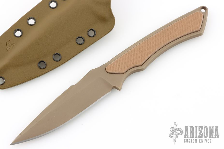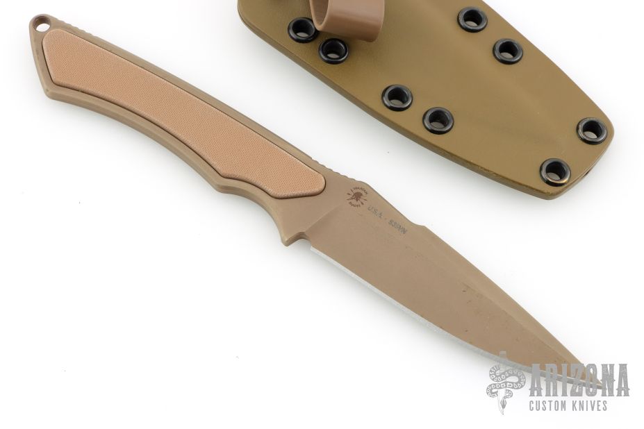 "Phrike is the goddess of horror / fear in Greek mythology. Her name literally means "tremor, shivering". This small lightweight blade was specifically designed to be carried as a self defense tool / bushcrafting blade. It's short 4.25 inch blade and minimal inset handles make it very comfortable and slim. This useful blade can be used on a daily basis to manage common tasks or for use in unexpected situations / emergencies." This Phrike features a CPM S35VN blade with Flat Dark Earth coating (SpartaCoat - PVD - ZrN) and a coyote G10 handle. Includes a kydex sheath. Has a couple light scuffs, otherwise excellent condition.