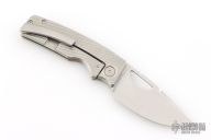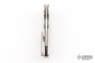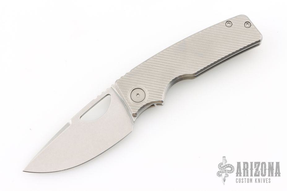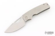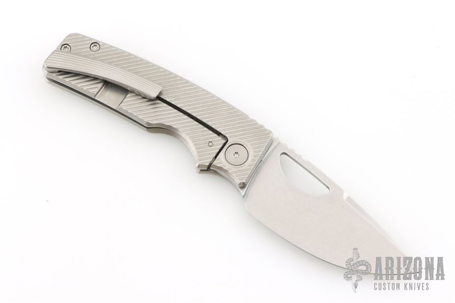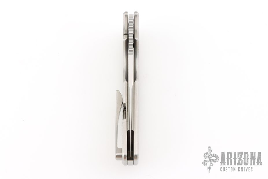 This knife by the OZ Machine Company features a tumbled Elmax blade with thumbhole and notched thumbrest. The handle features a bead blast finished titanium frame with a matching titanium backspacer and tip up clip with hidden screws. Includes box and papers dated 7-9-25 and s/n 4239. Excellent condition.