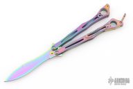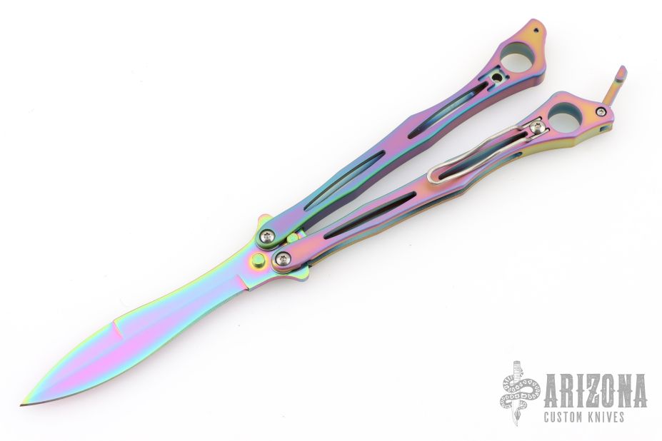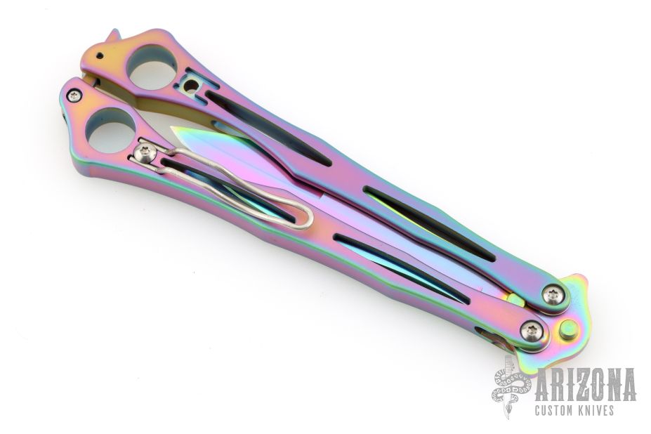 This Spyderfly from Spyderco features a rainbow finished spear point blade with a false top edge. The handles are rainbow finished stainless steel with a tip up clip (4-way reversible). Comes with original box and papers. Excellent condition.