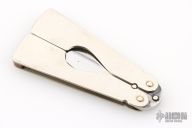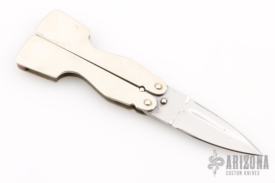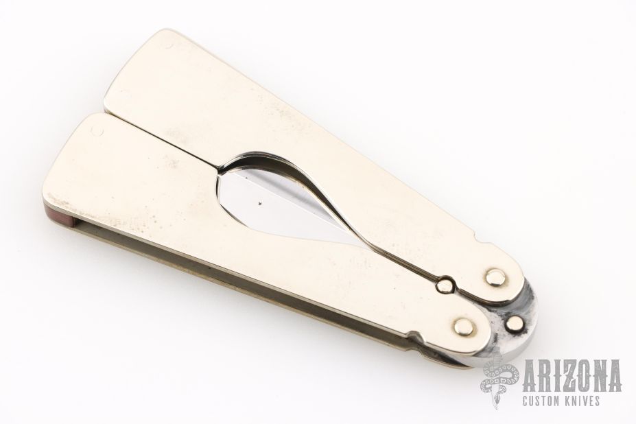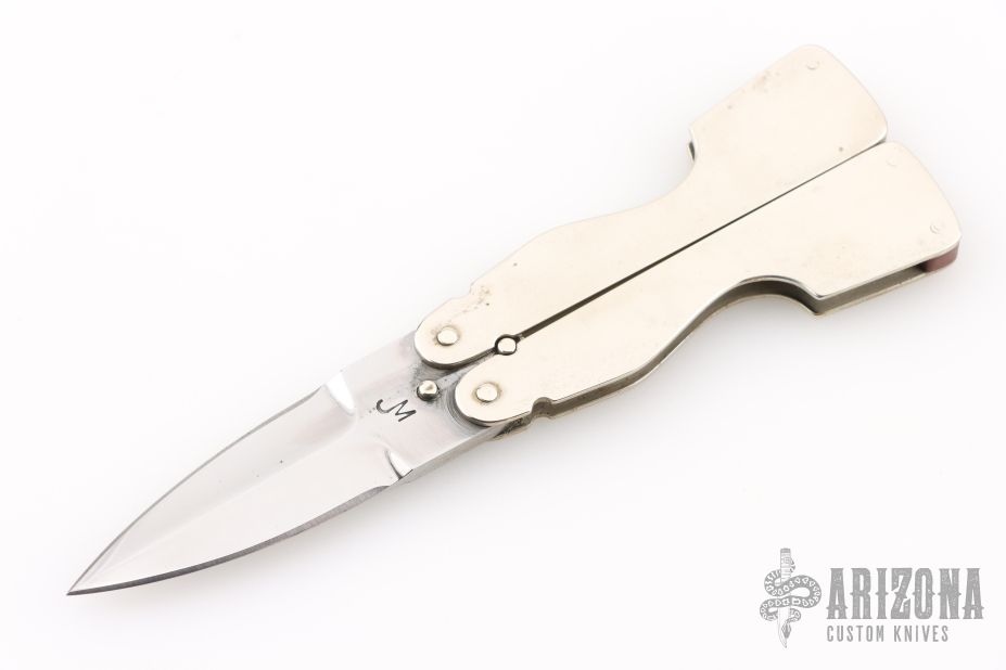 This balisong by Jeff Morgan features a satin polished double edged blade. The handles are polished nickel silver with red linen micarta spacers. Has some light scratches, otherwise excellent condition.