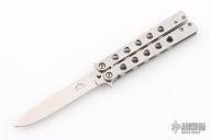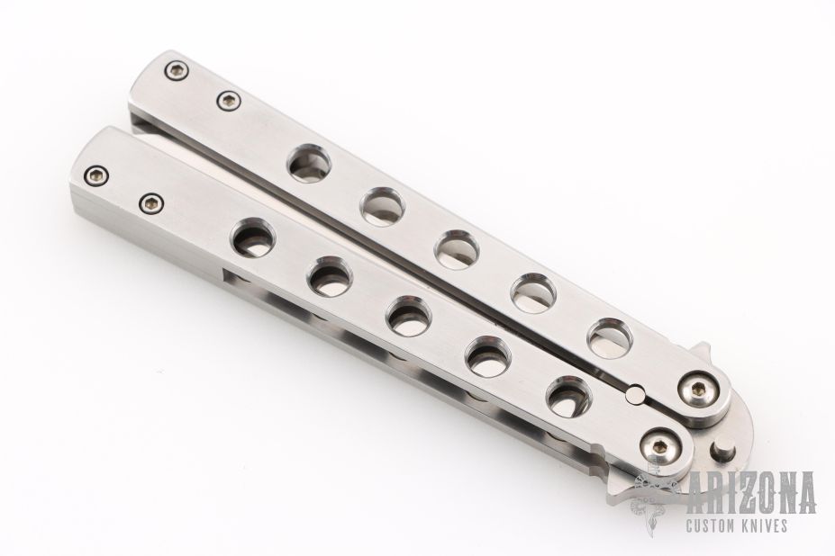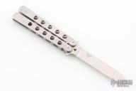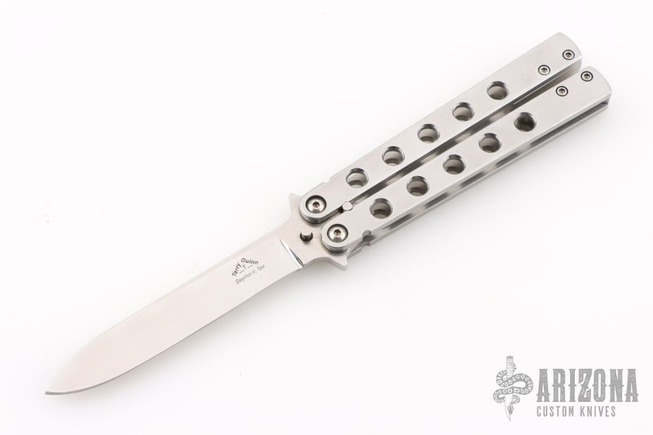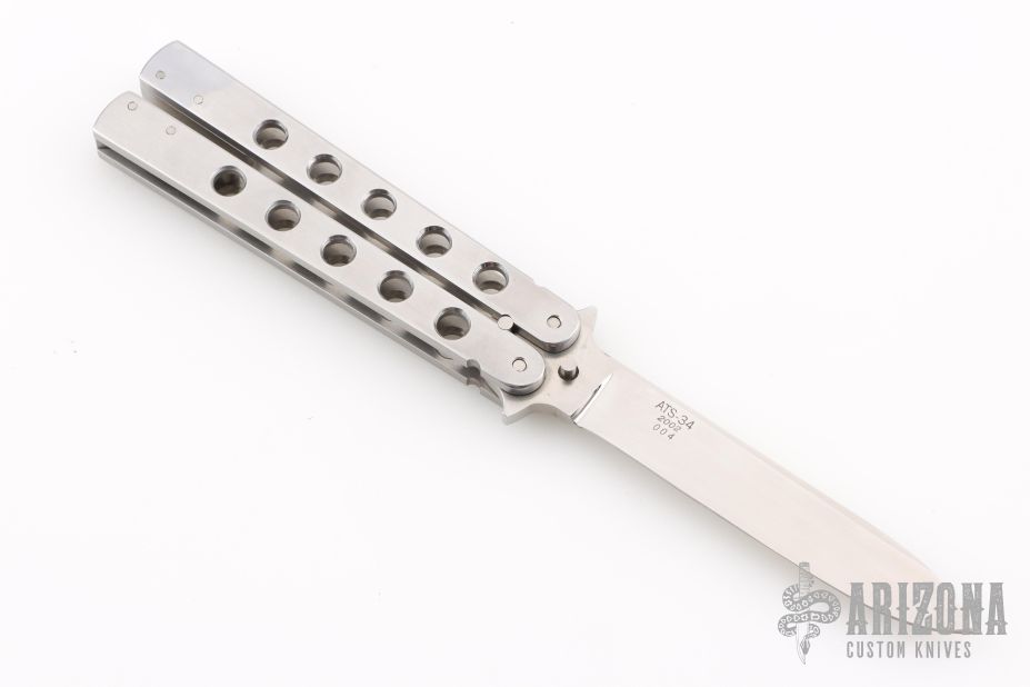 This Balisong by Terry Guinn features hand rub satin finished blade. The handles are satin finished stainless steel with matching spacers. Marked "ATS-34 2002 004" on the blade. Has some light scratches, otherwise excellent condition.