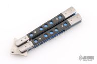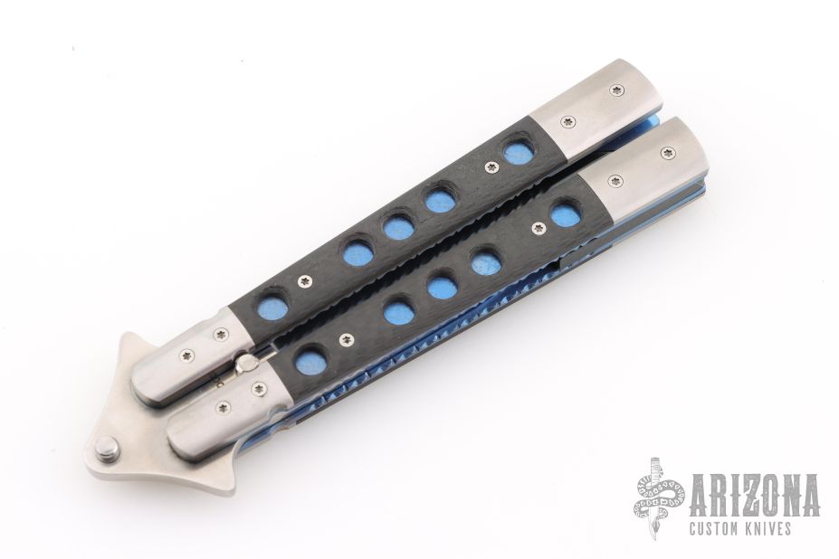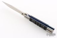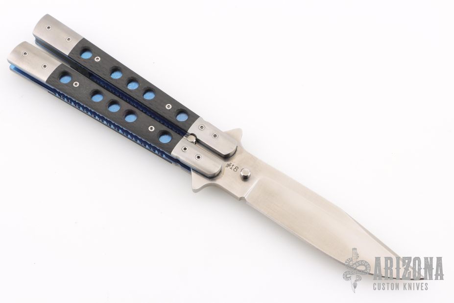 This Balisong by Les Voorhies features a satin finished blade. The handles have satin finished stainless steel bolsters, carbon fiber scales, orange peel finished and fileworked titanium liners that are anodized blue, black G-10 backspacers. Rides on bearings. #18 on blade. Has a couple of very light scratches, otherwise excellent condition.