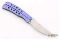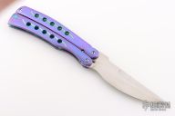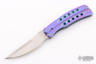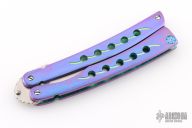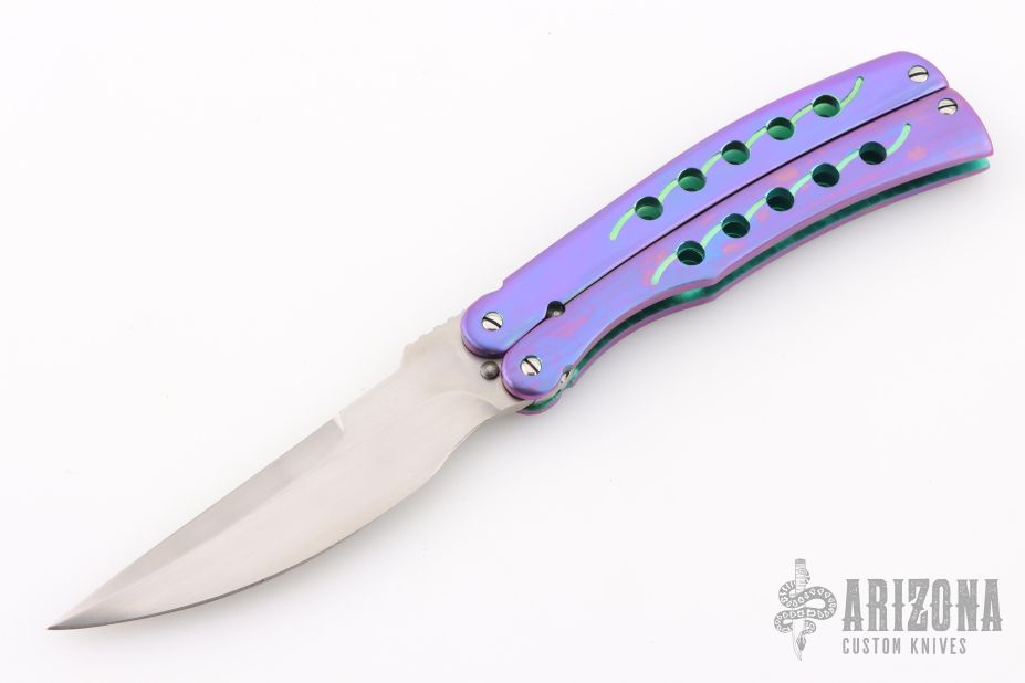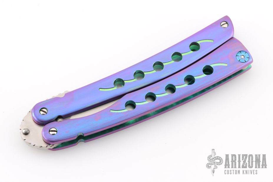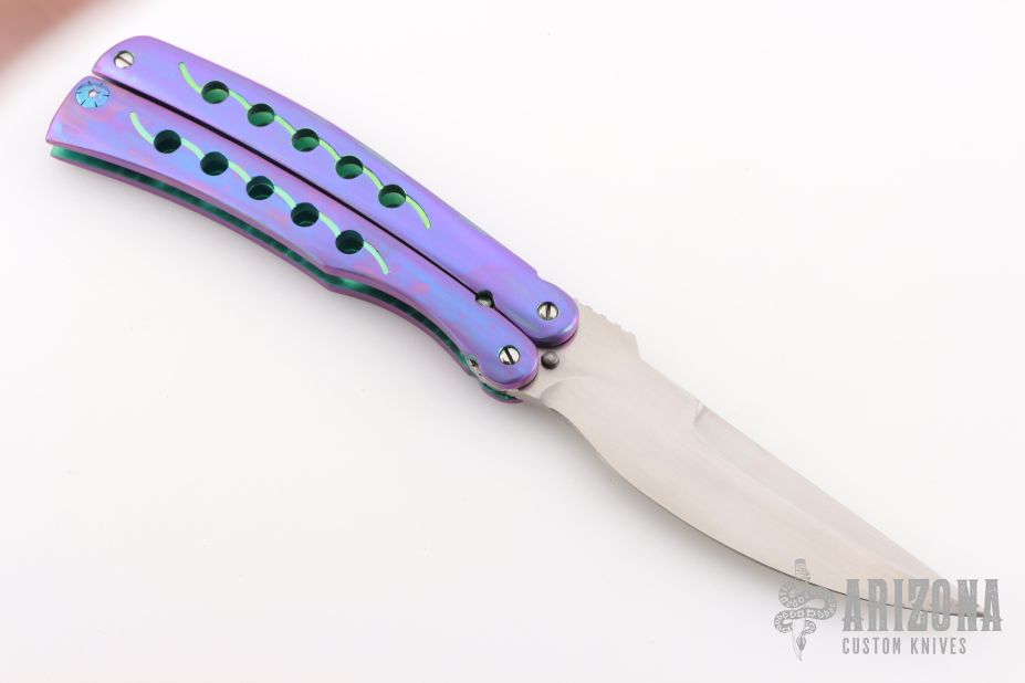 This Balisong by Butch Vallotton features a hand rub satin finished blade with false top edge and notched thumbrest. The tang of the blade has been fileworked. The handles are two-tone anodized titanium with polished spacers. Has a couple light scratches, otherwise excellent condition.