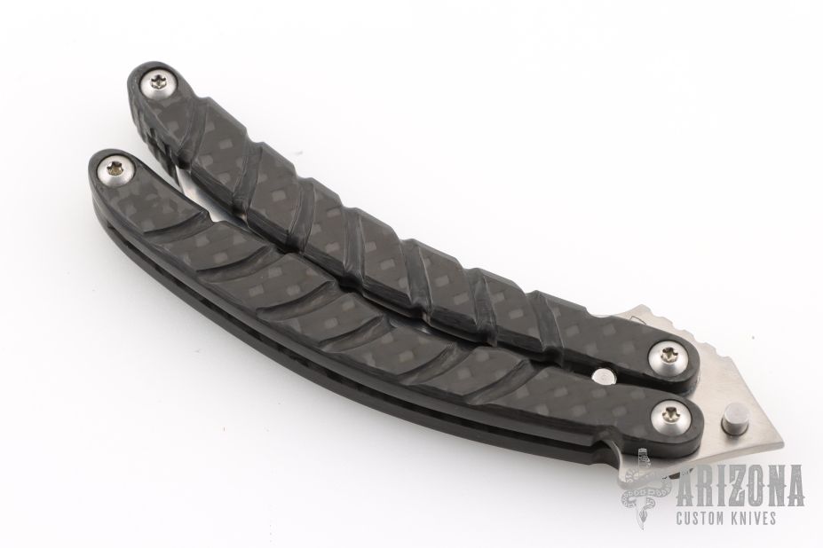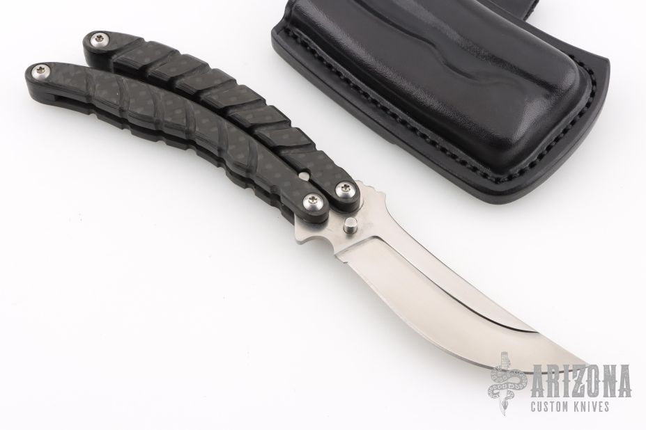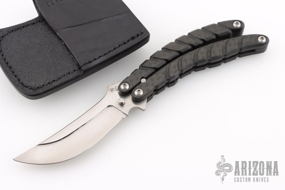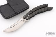 This balisong by Rick Haney features an upswept hand rub satin finished blade with a notched thumbrest. The handles are carved carbon fiber with black G-10 spacers. Comes with a custom black leather belt sheath. Has some light scratches, otherwise excellent condition.