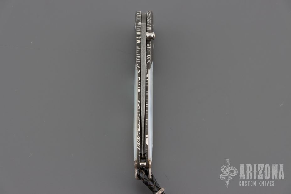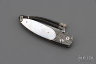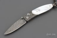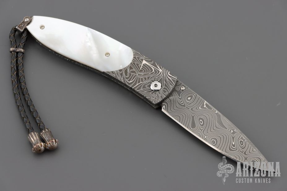 This B05 Riesling button lock folder by William Henry was an AG Russell exclusive! It features a Devin Thomas Stainless "Typhoon" Damascus blade with single thumbstud with sapphire inlay. The handle has a Larry Donnelly Carbon Damascus frame with mother of pearl scales. Sapphire insets in thumb stud and button lock. Sterling silver bail and beads. Includes original box, leather sheath and certificate of authenticity dated March 26, 2008. Excellent condition.