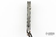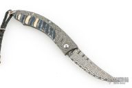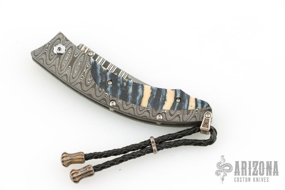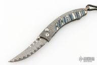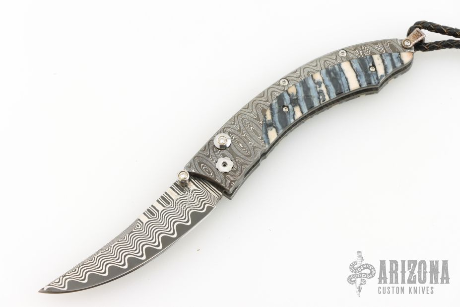 This B11 by William Henry features a Wave ZDP-189 core Damascus blade, single thumbstud with diamond inset, matching inset in button release both with 18K gold bezels. The handle has a Mike Norris Carbon "Ladder" Damascus frame with mammoth tooth inlays, titanium barrel spacers, sterling silver lanyard bail, and a braided leather lanyard with silver beads. Comes with original box, sheath and COA dated April 30, 2008 and #13 of 500. Excellent condition.