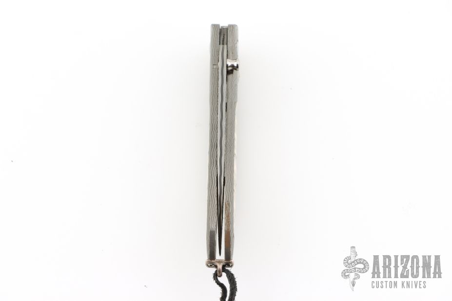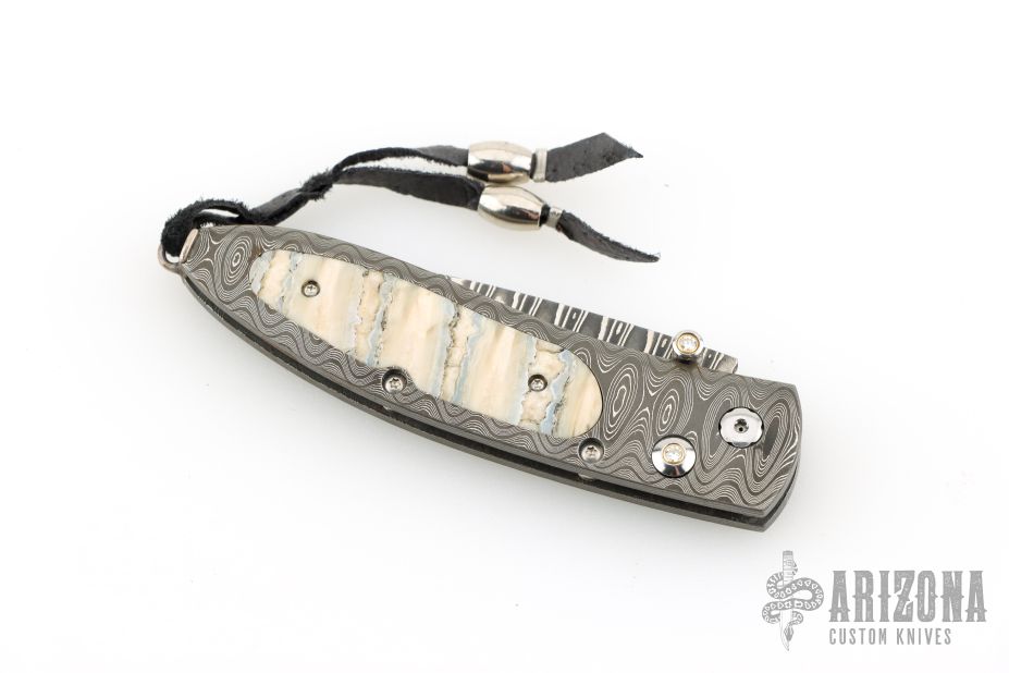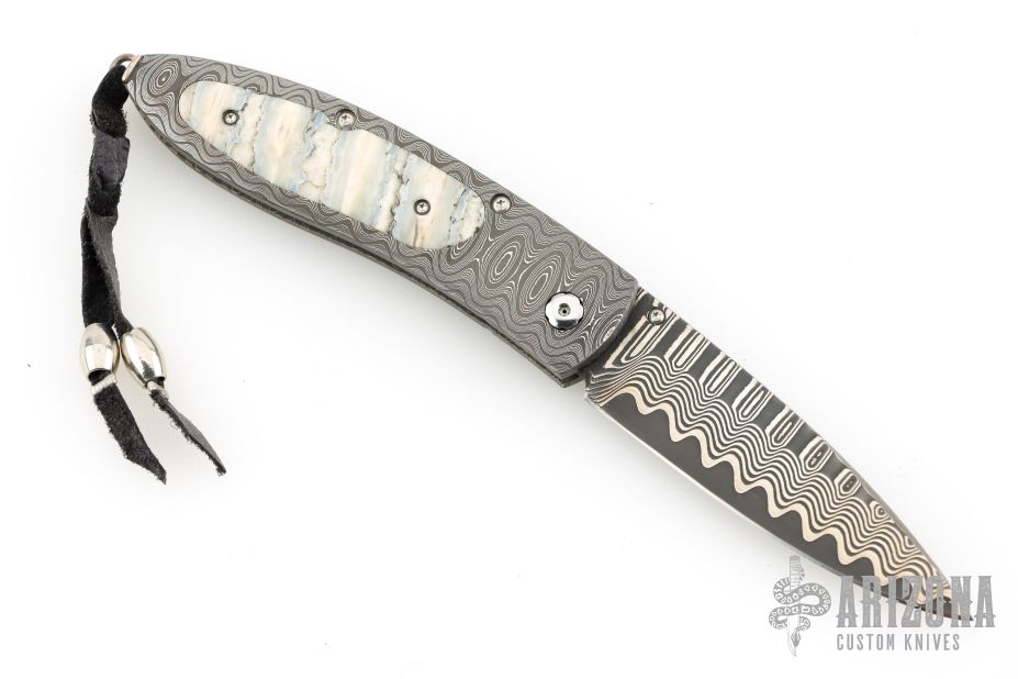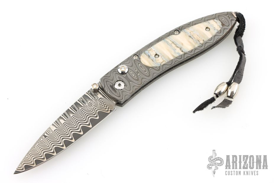 This B05 Monarch by William Henry features a Wave ZDP-189 core Damascus blade with single thumbstud with a Diamond inset, matching button lock. The handle has a Mike Norris Carbon "Ladder" Damascus frame with mammoth tooth inlays. Comes with original box, sheath and COA dated February 12, 2008. Excellent condition.
