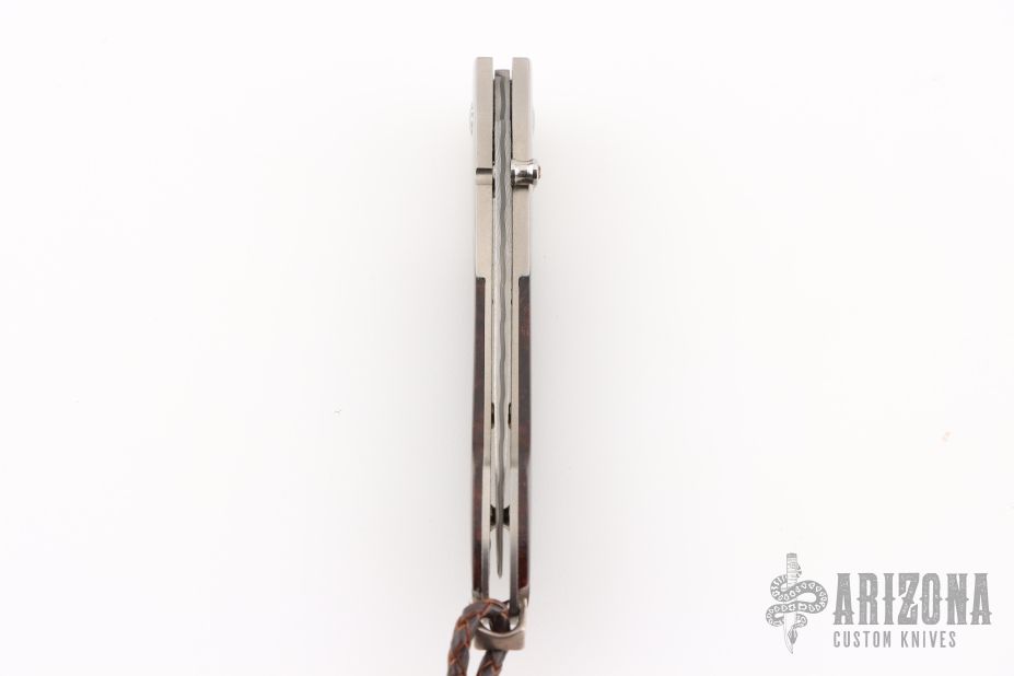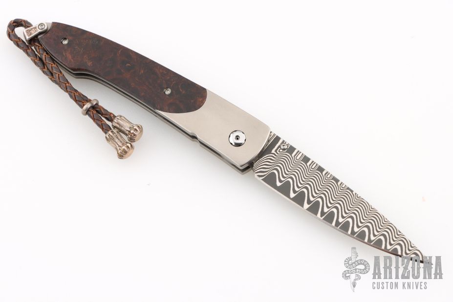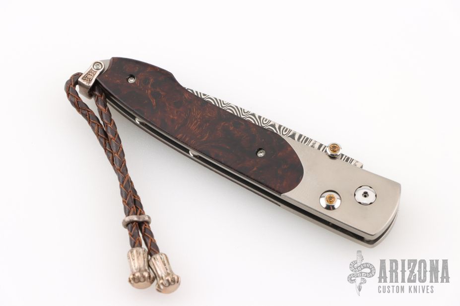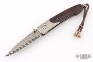 This folder by William Henry features a bead blasted titanium frame with ironwood inlays. Citrine inlays in thumb stud and push button. The push button releases the lock and allows you to close the knife. The drop point blade is Wave ZDP-189 core San Mai Damascus. Includes original box, sheath and COA dated January 16, 2009 and #163/500. Excellent condition.