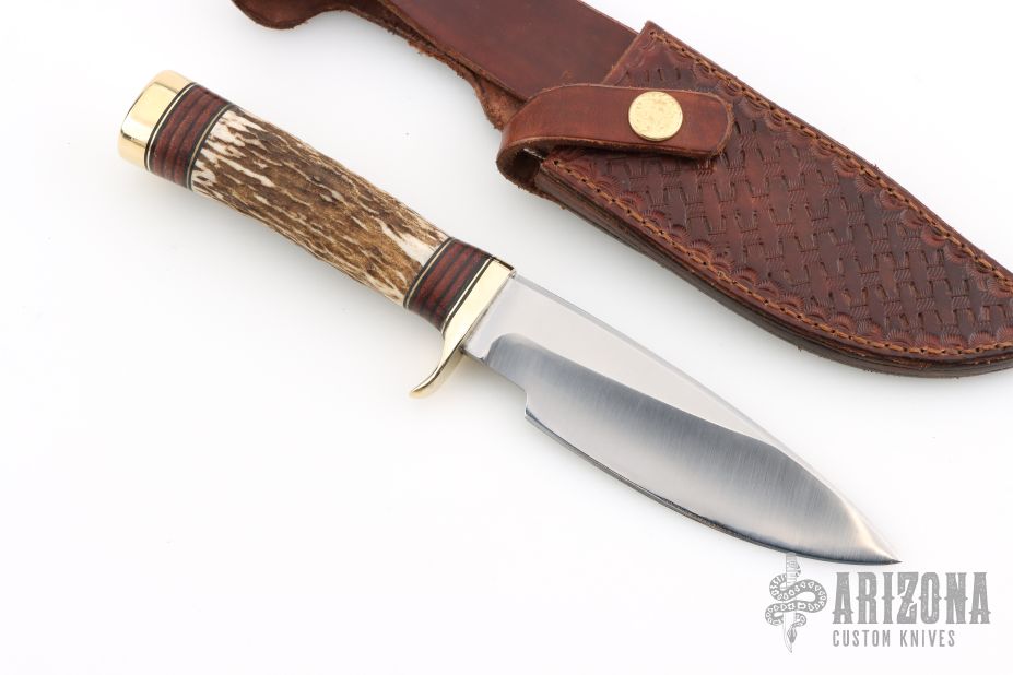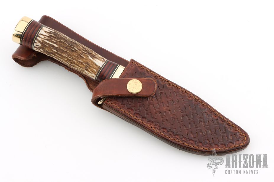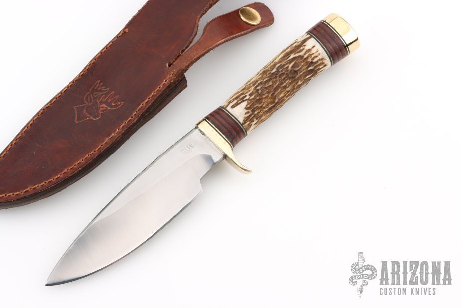 This knife by Rue Knives features a satin finished blade with notched thumbrest, .261" blade stock and 1.358" blade depth, hidden tang construction. The handle has a brass guard and butt, elk antler grip, black/brass/leather spacers. Comes with original box, COA and hand tooled brown leather sheath. New from maker!