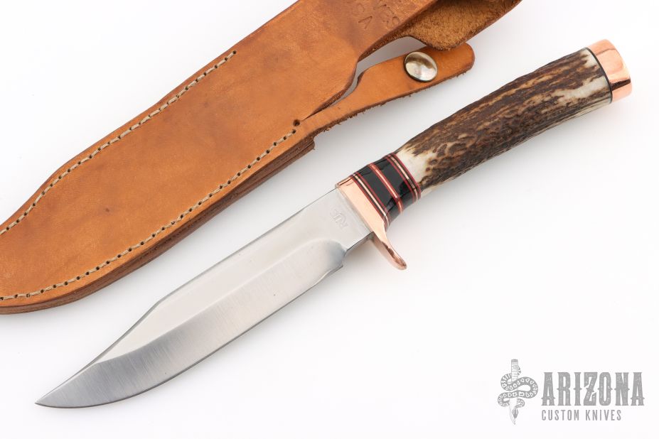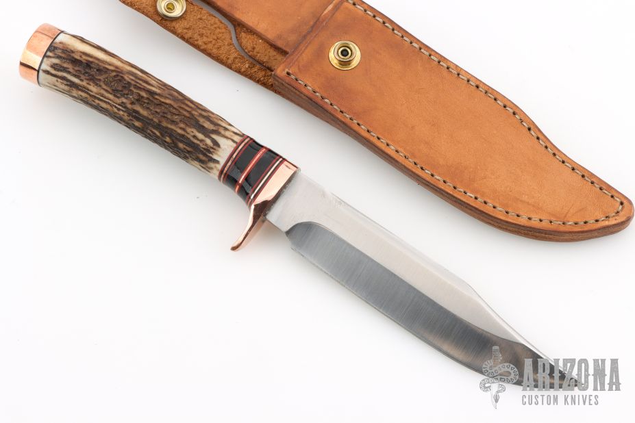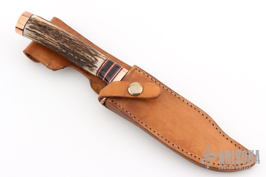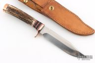 This knife by Rue Knives features a satin finished blade with a false top edge, .264" blade stock and 1.205" blade depth, hidden tang construction. The handle has a copper guard and butt, elk antler grip, red/black/brass/copper/buffalo horn spacers. Comes with original box, COA and a brown leather sheath. New from maker!