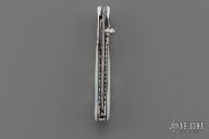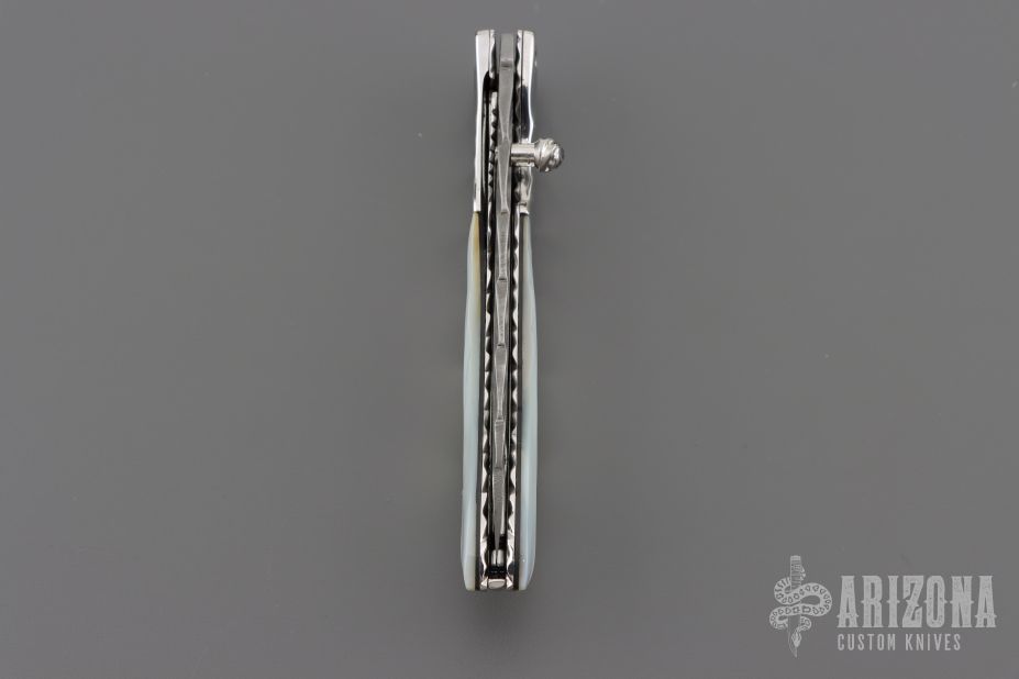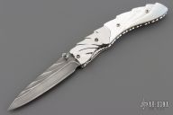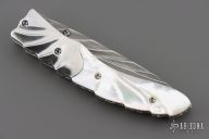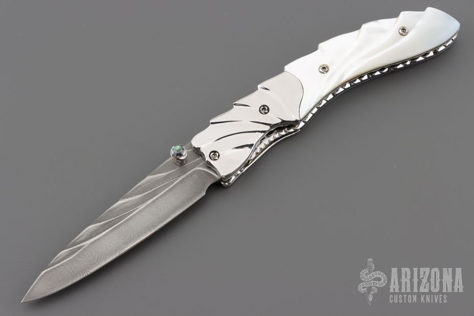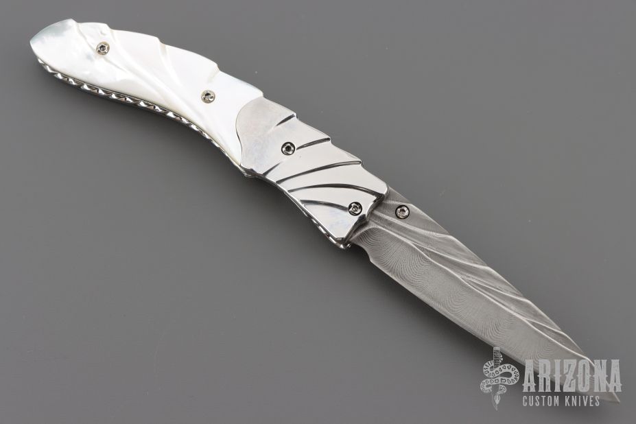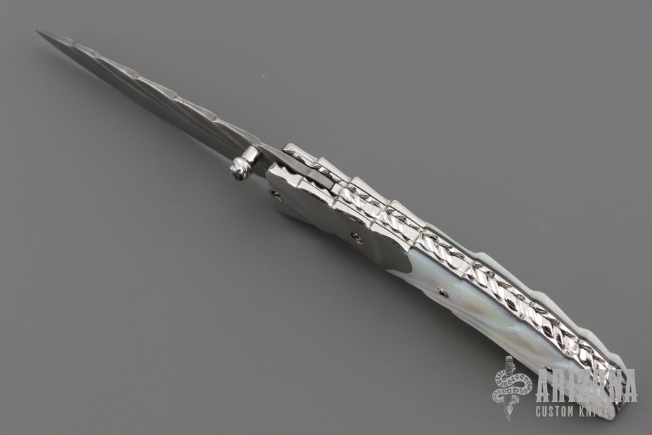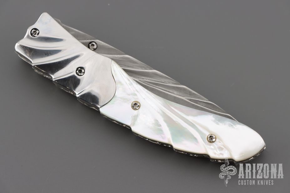 This linerlock by Appaloosa Knives features a Damascus blade with carved flats and spine, a single thumbstud with abalone inlay. The handle has carved mirror polished stainless steel bolsters, carved mother of pearl scales with black liners, fileworked stainless steel liners and backspacer. Nice detent, lockup and blade seating. Comes with a zippered case. Excellent condition.