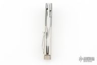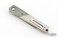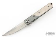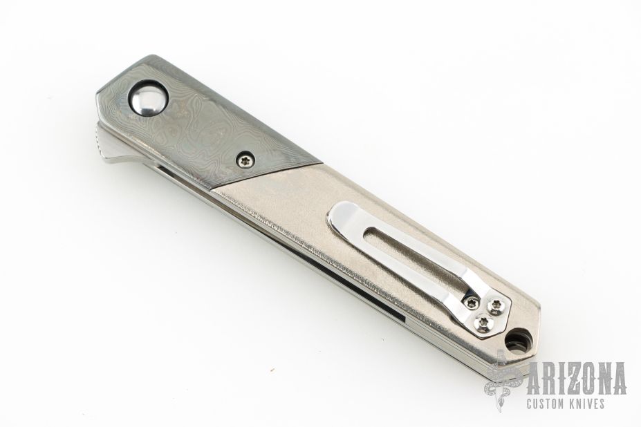 This Burnley Designed Mini Kwaiken flipper features a two-tone blade with a notched flipper tab.  The handle has Damascus bolsters, orange peel finished stainless steel scales, polished stainless steel liners and backspacer. Rides on bearings, nice detent, lockup and blade seating. Includes a zippered case. Excellent condition.