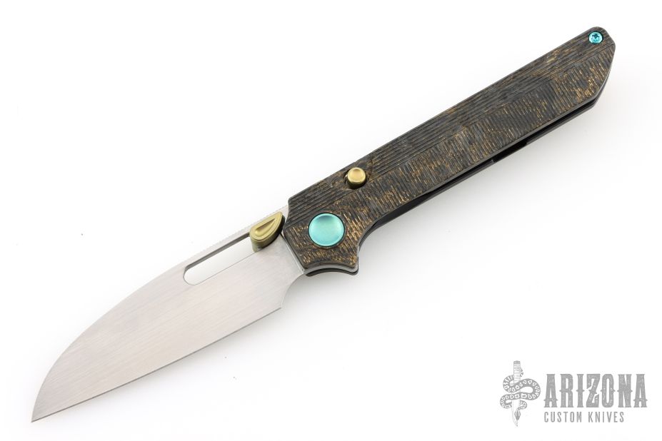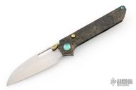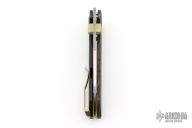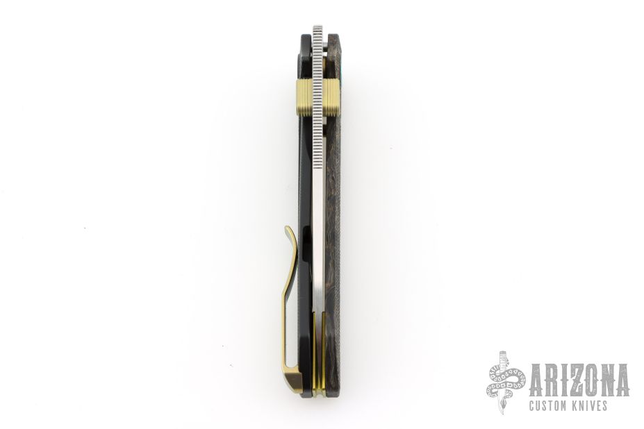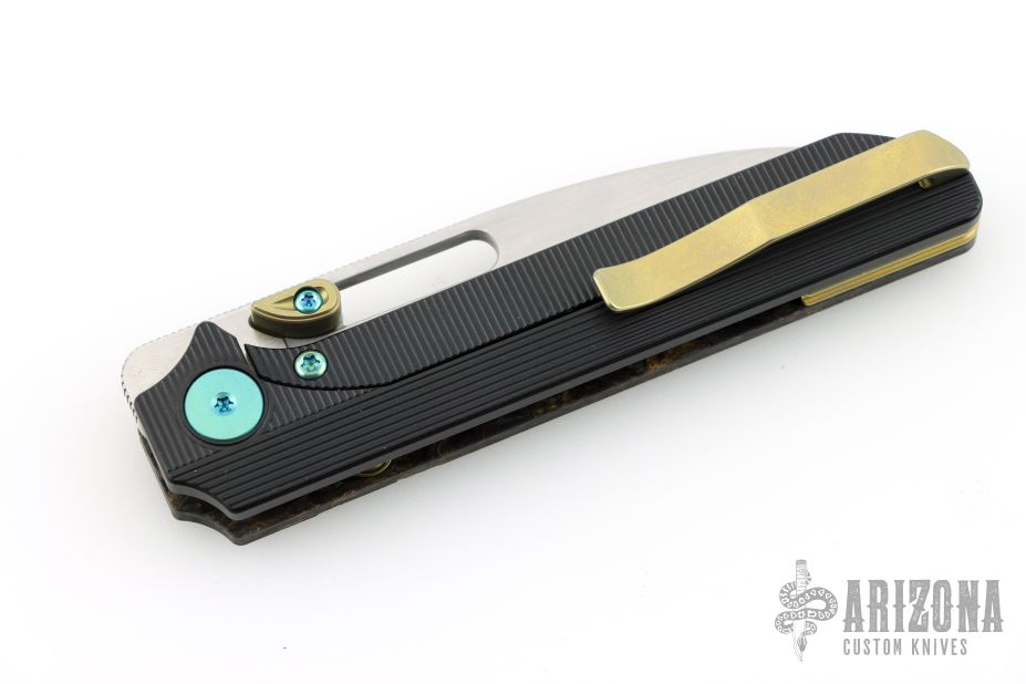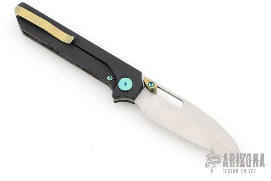 This SLIM by Golden Designworks features a hand rub satin finished blade with thumbhole, dual thumbstuds and notched thumbrest. Works well as a front flipper. The handle has milled black finished titanium scales, gold carbon fiber cover scale, gold anodized titanium backspacer and tip up clip. Comes with original box, zippered case and papers. Listing also includes another set of hardware. Excellent condition.