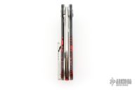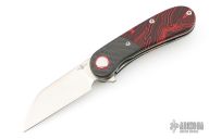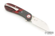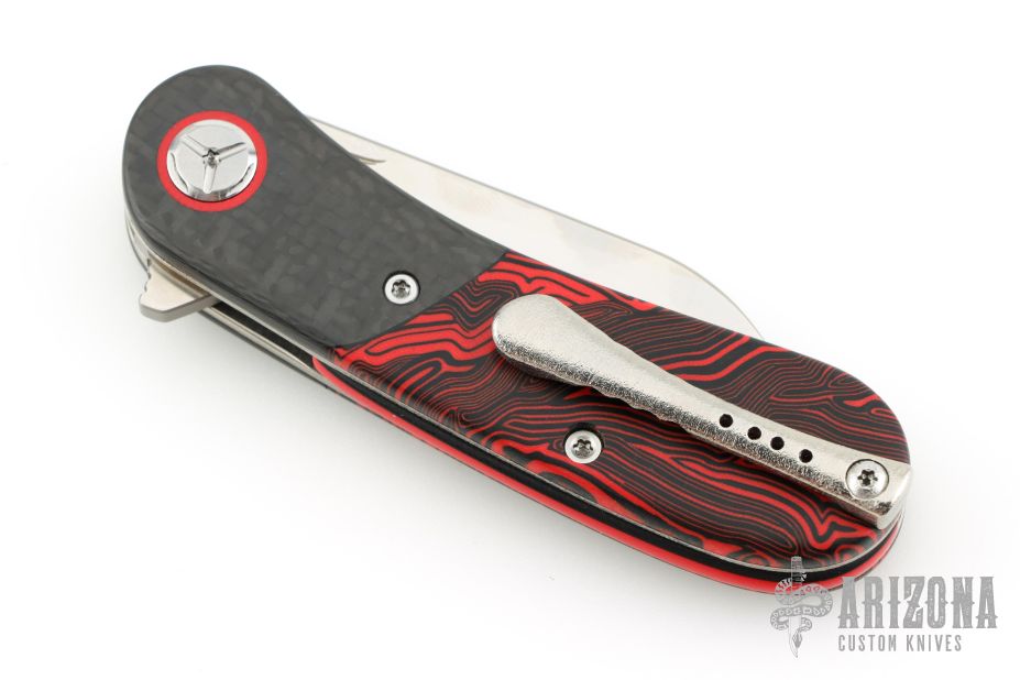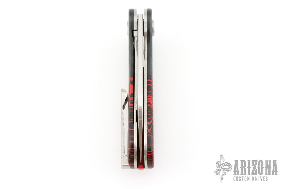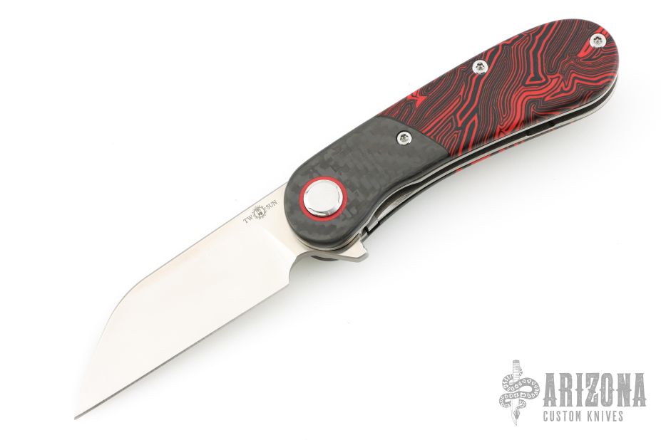 This Linerlock Front Flipper by TwoSun knives features a satin finished blade with a flipper. The handle has custom carbon fiber dovetailed bolsters and red/black unique micarta scales, orange peel finished stainless steel liners, orange peel finished titanium tip up clip, red/black G-10 backspacer. Rides on bearings, nice detent, lockup and blade seating. Comes with a zippered case. Excellent condition.