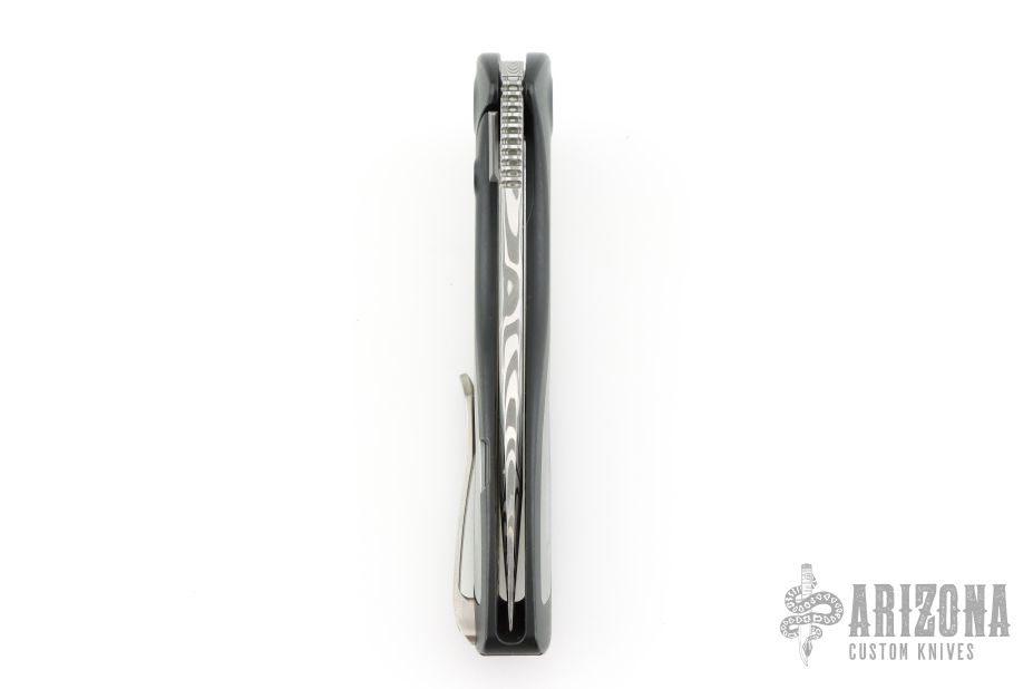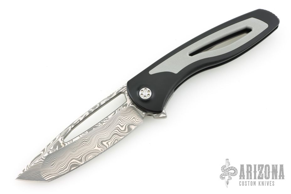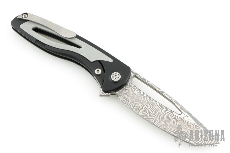 This Apex Flipper from Brian Nadeau features a Damasteel blade with a thumbhole, flipper and notched thumbrest. The handle is comprised of a black tumbled titanium frame with blasted aluminum inlays, satin titanium tip up clip. Rides on bearings, nice detent, lockup and blade seating, stainless lockface insert. Comes with a zippered case. Excellent condition.