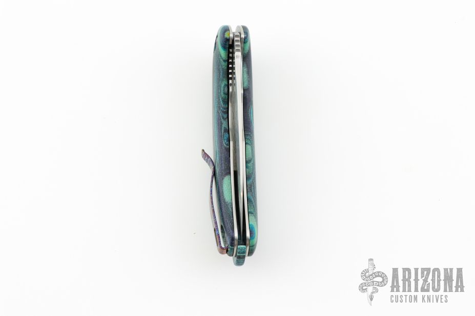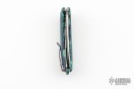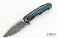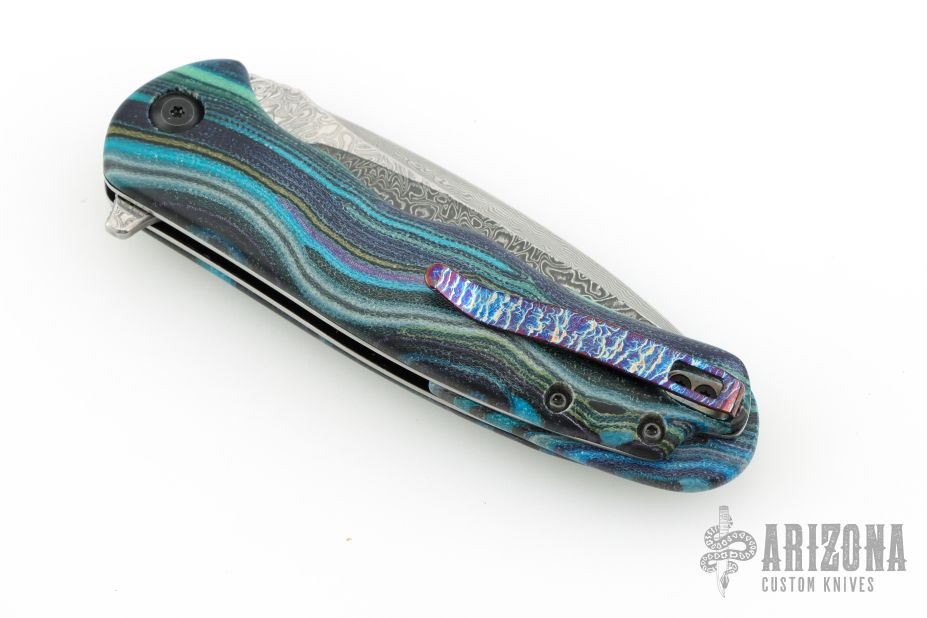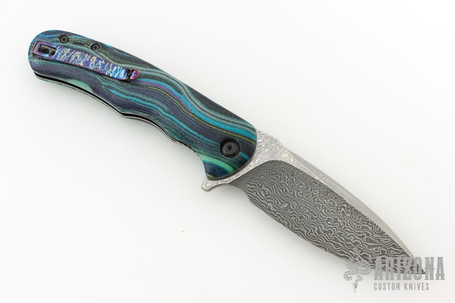 This Praxis Linerlock Flipper by Civivi features a Damascus blade with a custom two-tone finish, notched thumbrest and flipper. The handle has custom micarta scales and backspacer, stainless steel liners, tip up custom anodized titanium clip. Rides on bearings, nice detent, lockup and blade seating. Comes with a zippered case. Has a couple light scratches, otherwise excellent condition.