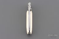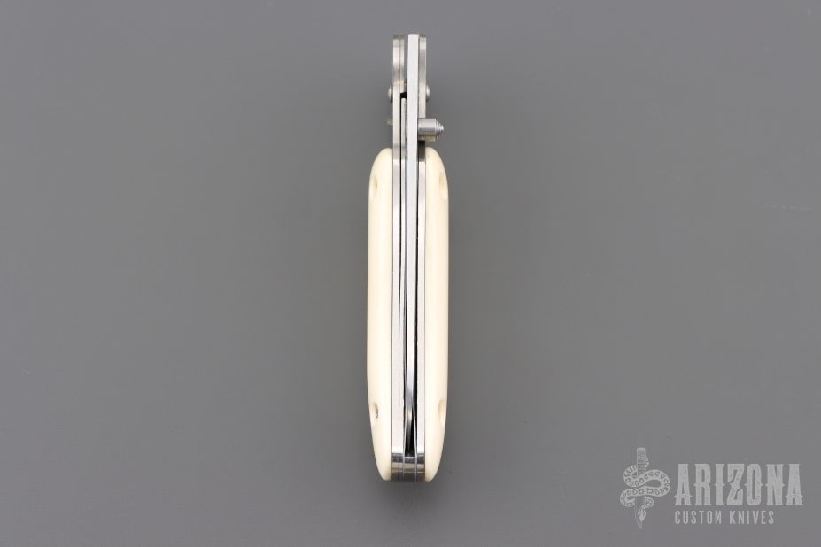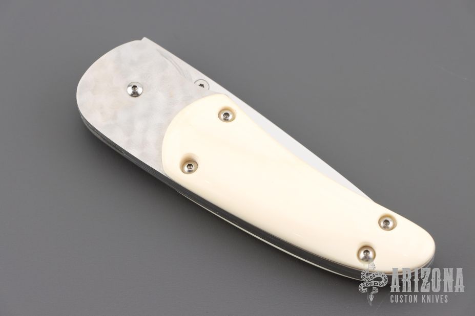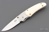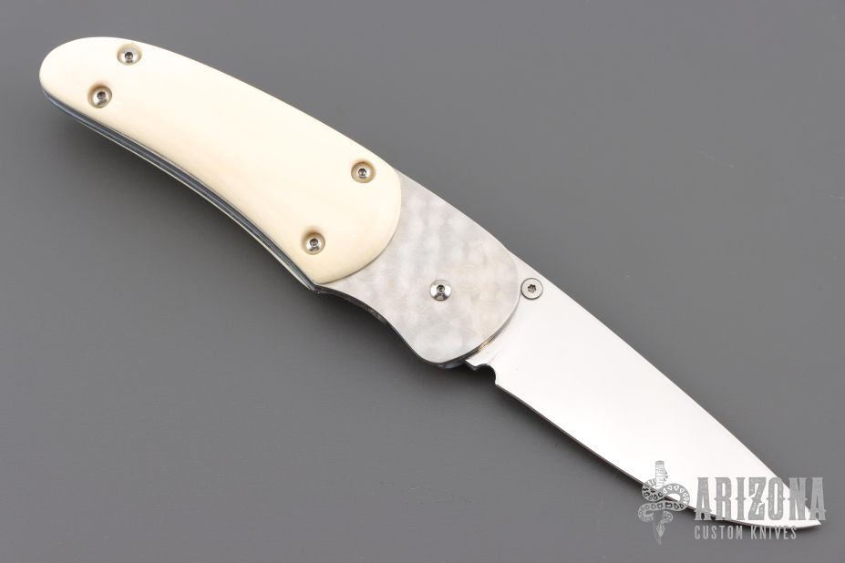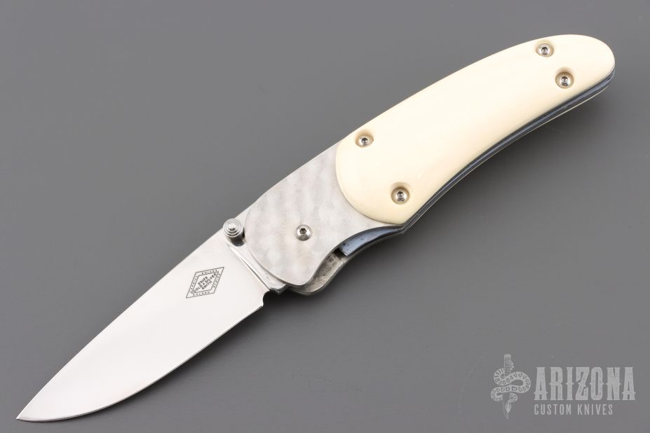 This linerlock by Cargill Knives features a mirror finished blade with single thumbstud. The handle has mammoth ivory scales, jeweled titanium liners, stainless steel backspacer. Has a few light scratches, otherwise good condition. Comes with a zippered case.
