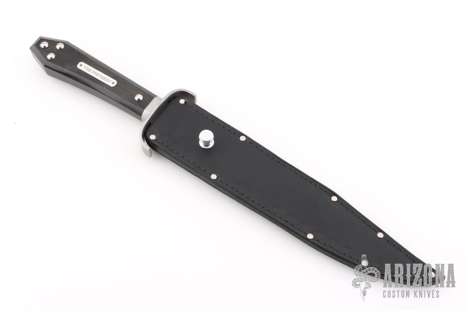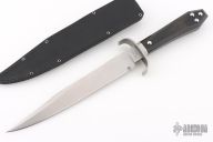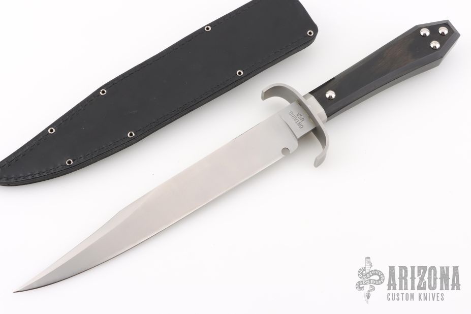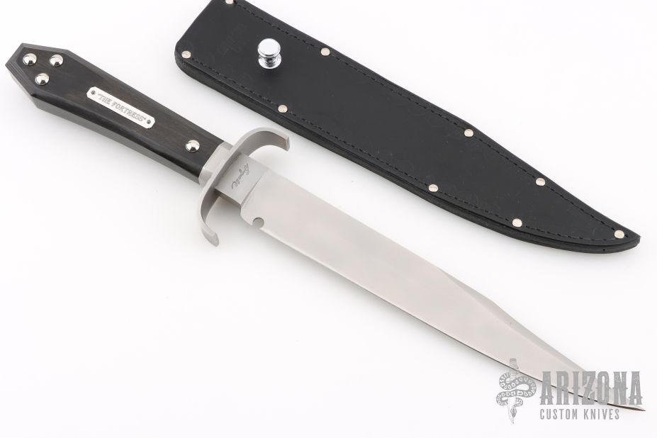 This is a discontinued Bill Bagwell designed Fortress Bowie, made by Ontario Knife, features a bead blasted blade with nearly sharpned top edge, .290" blade stock and 1.292" blade depth, hidden tang construction. The handle has a bead blasted stainless steel guard, wooden coffin handle with nameplate. Comes with original box and black leather sheath. Excellent condition.