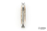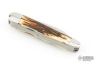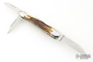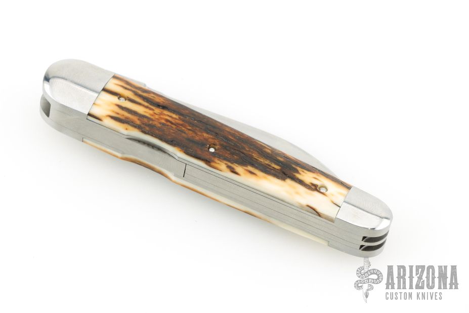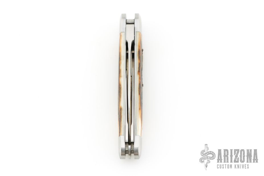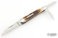 This Lockback Whittler by Bill Ruple, features a large single blade that is engaged by the lockback. The remaining two blades are slipjoints, they both have half stops and are flush in all positions. The handle has stainless steel bolsters, mammoth covers with a stainless steel escutcheon, stainless steel liners and springs. Includes maker's padded zippered case. New from Maker!