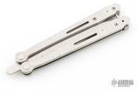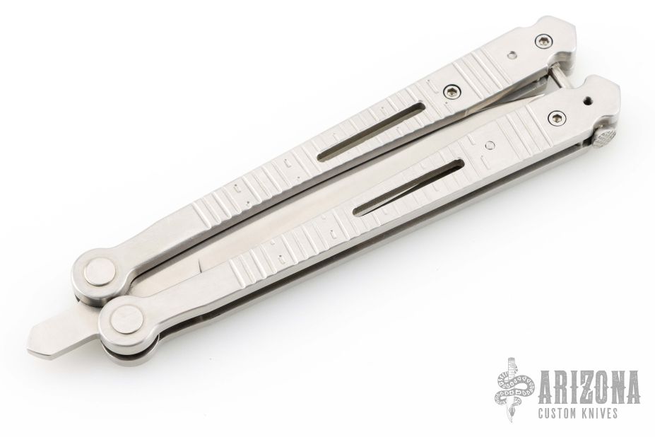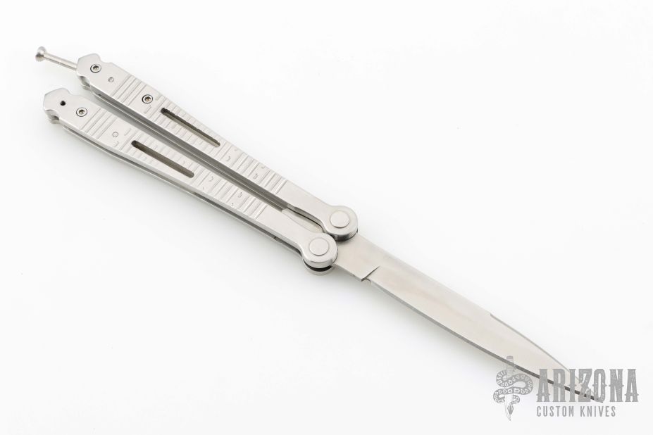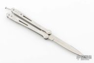 This Balisong by Rob Dalton features a satin finish spearpoint blade with crossed knives Dalton logo. Has milled and satin finished stainless steel handles with spring latch. Great work. Has a couple light scratches, otherwise excellent condition.