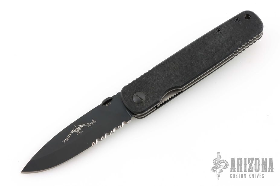 Ernie Emerson says "Symmetry, Grace, and Power. These three words describe the Emerson Model A100 knife perfectly. When I first started making knives, before “Tactical”, I was making this pattern. I liked it then just as much as I like it now. This knife became the archetype from which all of my other designs have evolved . It is the “Father” of all my tactical designs. In fact it might be the “Grandfather” of all tactical knife designs that now exist. It’s simple, it works, and it never gives up. See for yourself." This knife has a black spearpoint partially serrated blade with thumbdisc. The handle has textured black G-10 scales, titanium liners, black G-10 backspacer and a tip up black stainless steel clip. S/N 0225and dated 2008. Excellent condition. Comes with original box and papers.