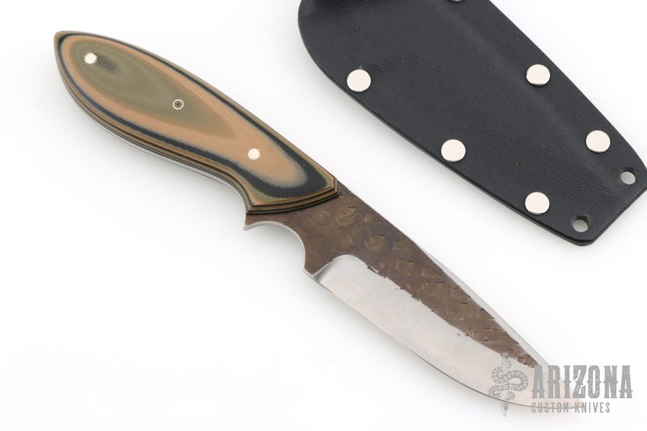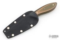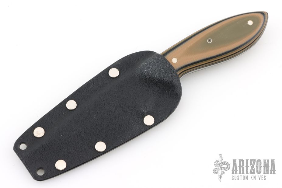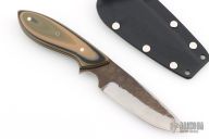 This perfect neck knife by Murray Carter features a white steel core laminated with 410 stainless steel drop point blade with a full tapered tang construction, .140" blade stock and 1.079" blade depth.  The handle features G-10 scales over black liners.  Includes a kydex neck sheath. Has some very light sheath scratches, otherwise excellent condition.
